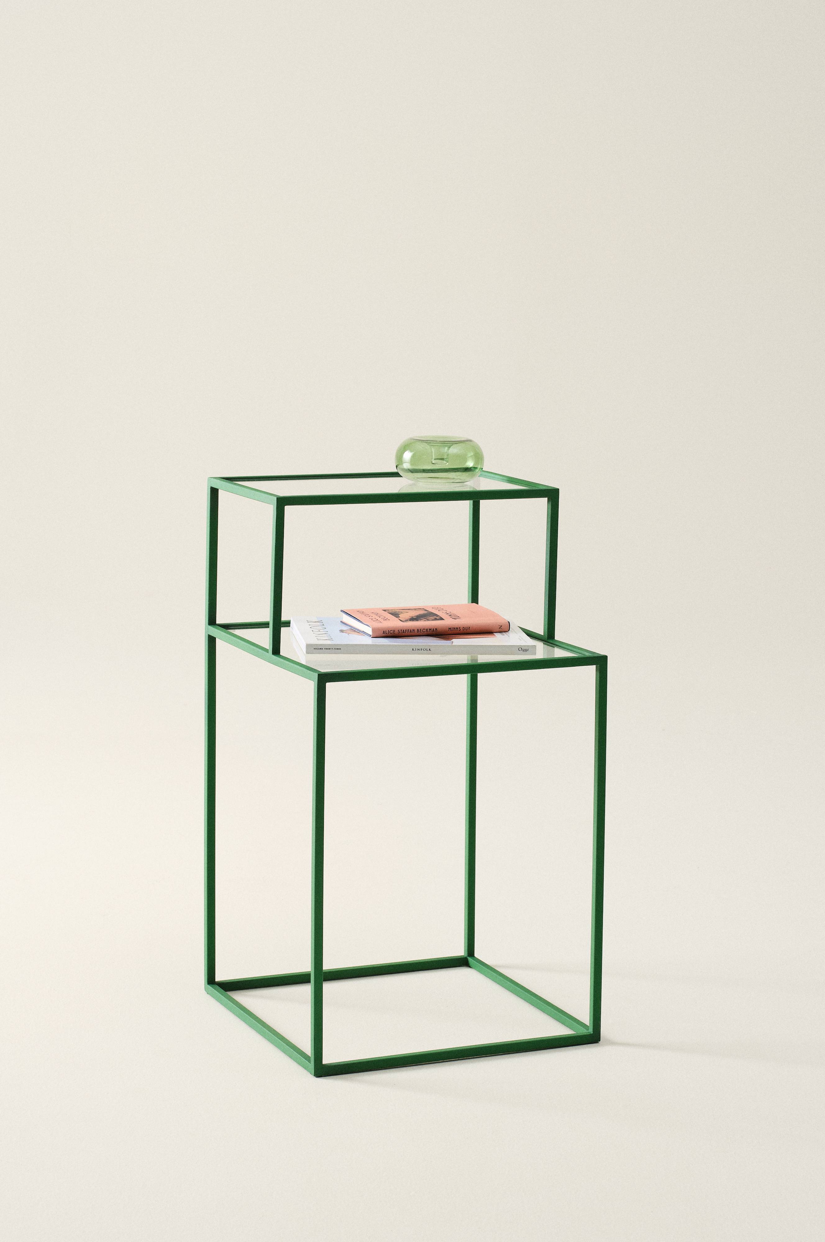 Sidobord av järn med två bordsskivor av glas som placerats på olika höjd, den ena lite större än den andra. Stommen är enfärgad och ytan har pulverlackerats med matt finish. Modellen inbjuder till många olika användningsområden och de glada färgerna piggar upp. Vill du göra ett mer stillsamt val så är det svarta bordet ett bra alternativ.