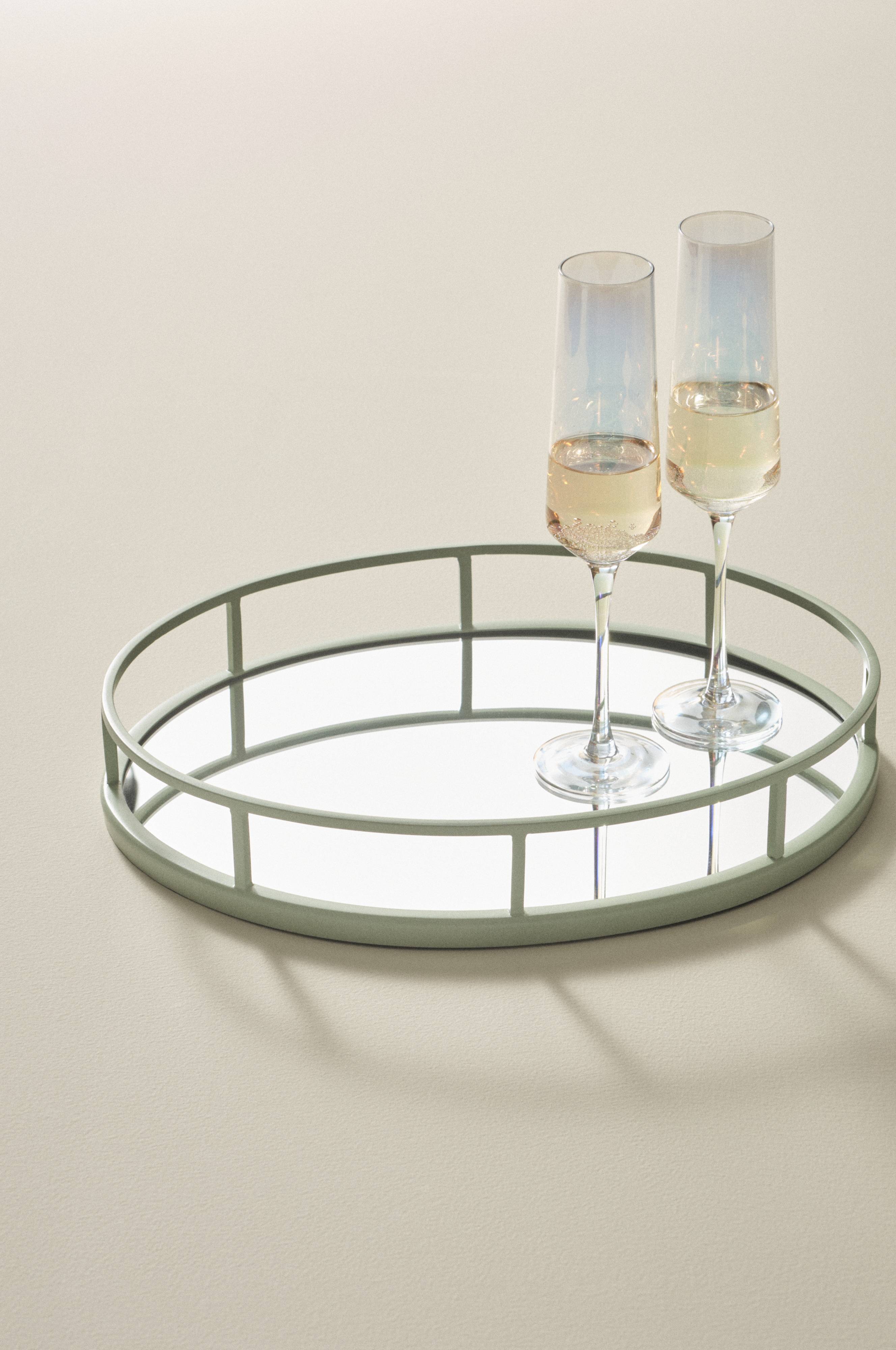 Oval bricka av metall med botten av spegelglas. JEMMA är en stilren bricka som blir en snygg detalj till din dukning.