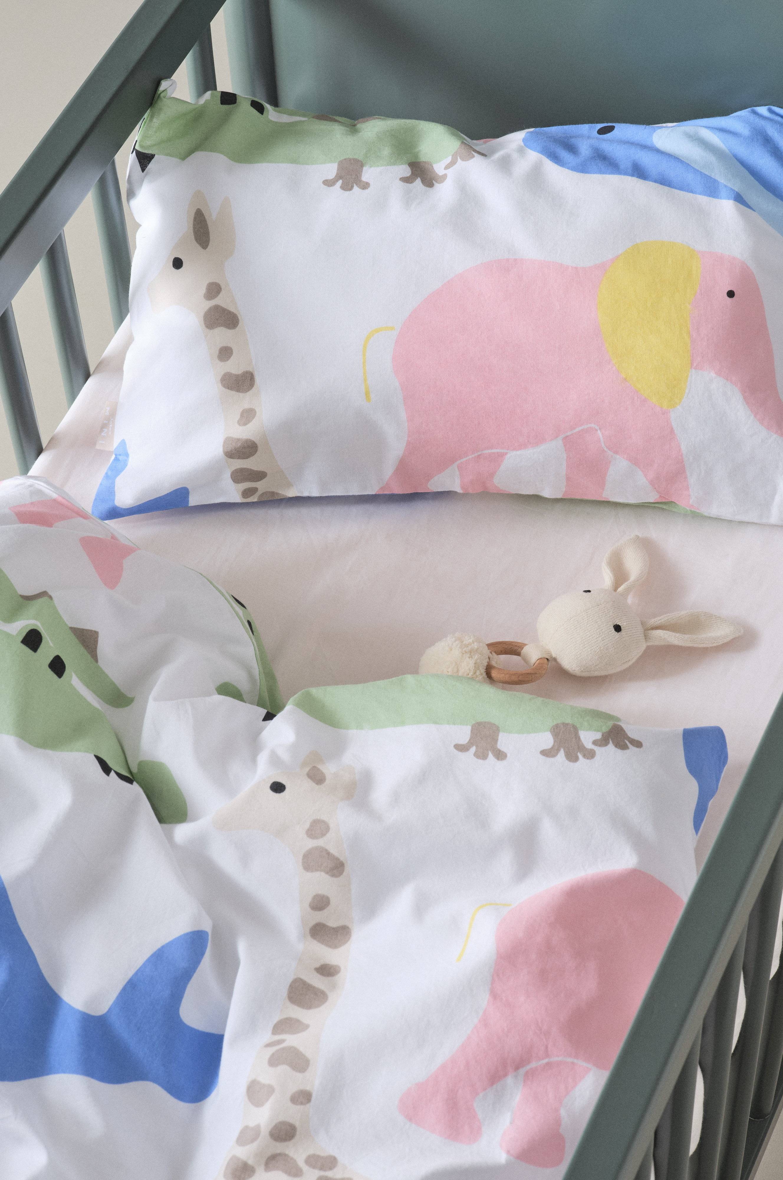 Mönstrat påslakanset till spjälsäng, med ett påslakan och ett örngott i härlig, ekologisk bomull. Tyget är plaggtvättat för att få en mjukare känsla, bomull känns svalt och skönt mot huden. Mönstret är tryckt i klara, glada färger på vit botten. Trådtäthet på 144 tc. (Trådtätheten talar om antalet trådar, thread counts, per kvadrattum i ett tyg. Ju högre trådtäthet desto högre kvalité.)