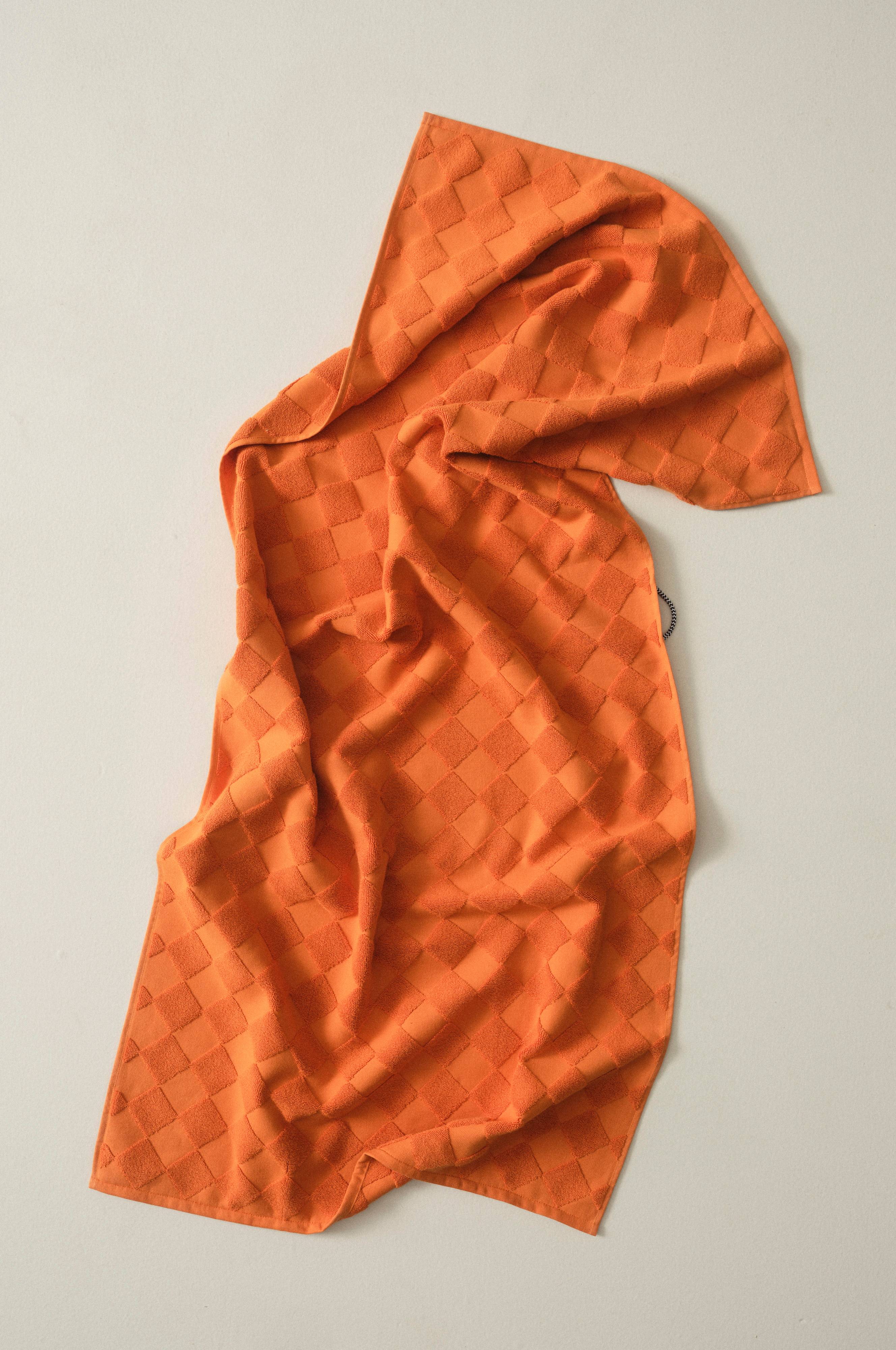 1-pack badhandduk i lyxig och snygg, enfärgad bomullsfrotté som är jacquardvävd. Det vävda rutmönstret är diagonalställt med slätvävda rutor och rutor vävda med öglor. Mönstret är motsatt på andra sidan. Den är dessutom vävd med dubbelgarn vilket ger exklusiv, kraftig känsla. Den lyxiga känslan förstärks av den snygga hängaren av svartvitt bomullsrep på långsidan. Frottén har bra uppsugningsförmåga och blir härligare ju mer den tvättas. Tillverkad i Portugal. Gramvikt 500 g/m².