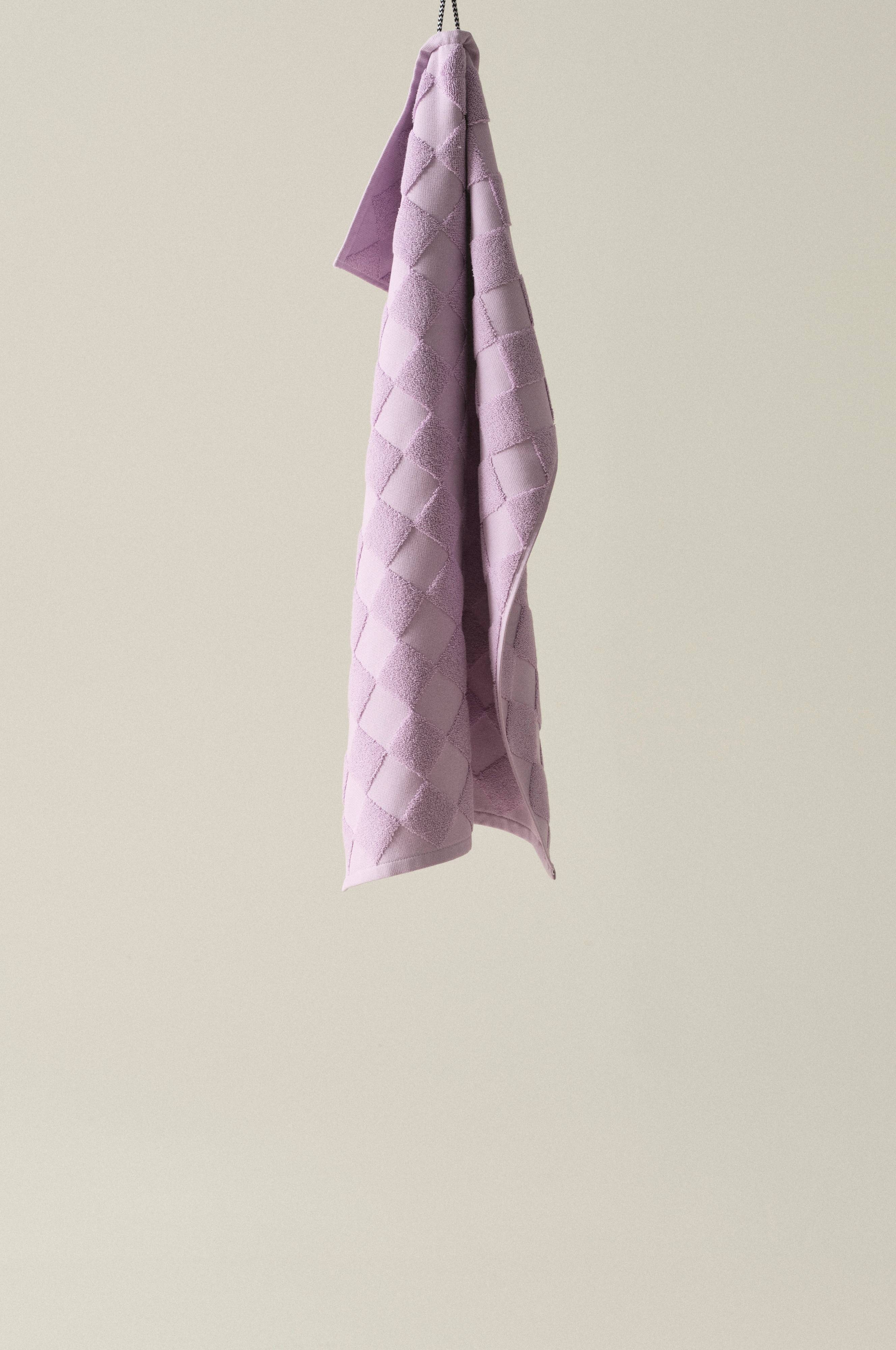 1-pack handduk i lyxig och snygg, enfärgad bomullsfrotté som är jacquardvävd. Det vävda rutmönstret är diagonalställt med slätvävda rutor och rutor vävda med öglor. Mönstret är motsatt på andra sidan. Den är dessutom vävd med dubbelgarn vilket ger exklusiv, kraftig känsla. Den lyxiga känslan förstärks av den snygga hängaren av svartvitt bomullsrep på kortsidan. Frottén har bra uppsugningsförmåga och blir härligare ju mer den tvättas. Tillverkad i Portugal. Gramvikt 500 g/m².