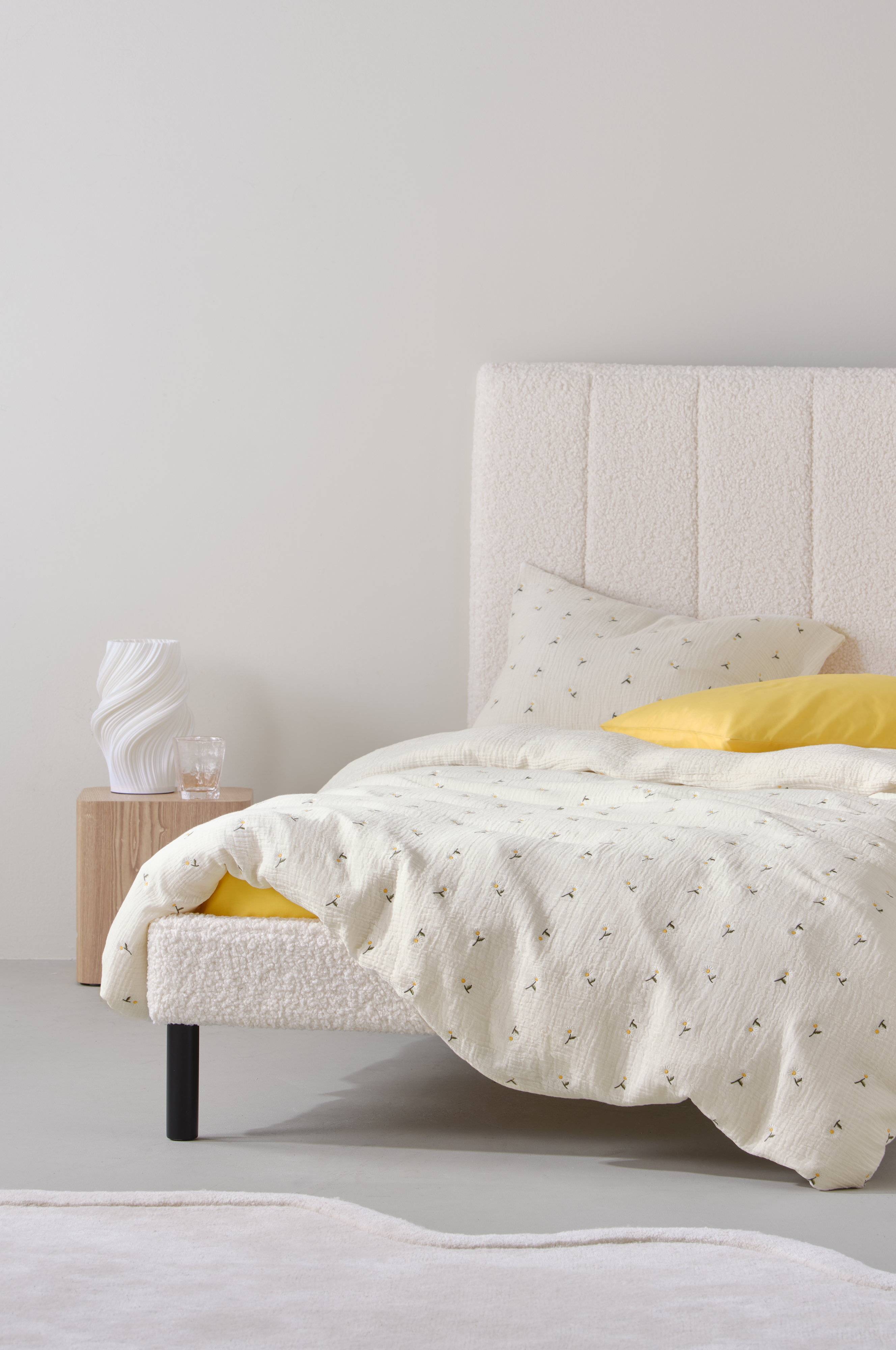 Påslakanset i två delar, ett påslakan och ett örngott, i härlig, ekologisk bomullsmuslin med broderade tusenskönor. Sängkläderna i serien DAISIES känns somrigt fräscha. Muslin är ett mjukt, tunt tyg i två lager, vävt med lite bubblig effekt, vilket gör tyget mjukt och extra lättskött. Du behöver inte stryka eller mangla. Det behagliga muslintyget är skönt att sova i. Öppning i övre hörnen på påslakanet, som underlättar att trä påslakanet över täcket. Baksidan är enfärgad. Trådtäthet på 178 tc. (Trådtätheten talar om antalet trådar, thread counts, per kvadrattum i ett tyg. Ju högre trådtäthet desto högre kvalité.)