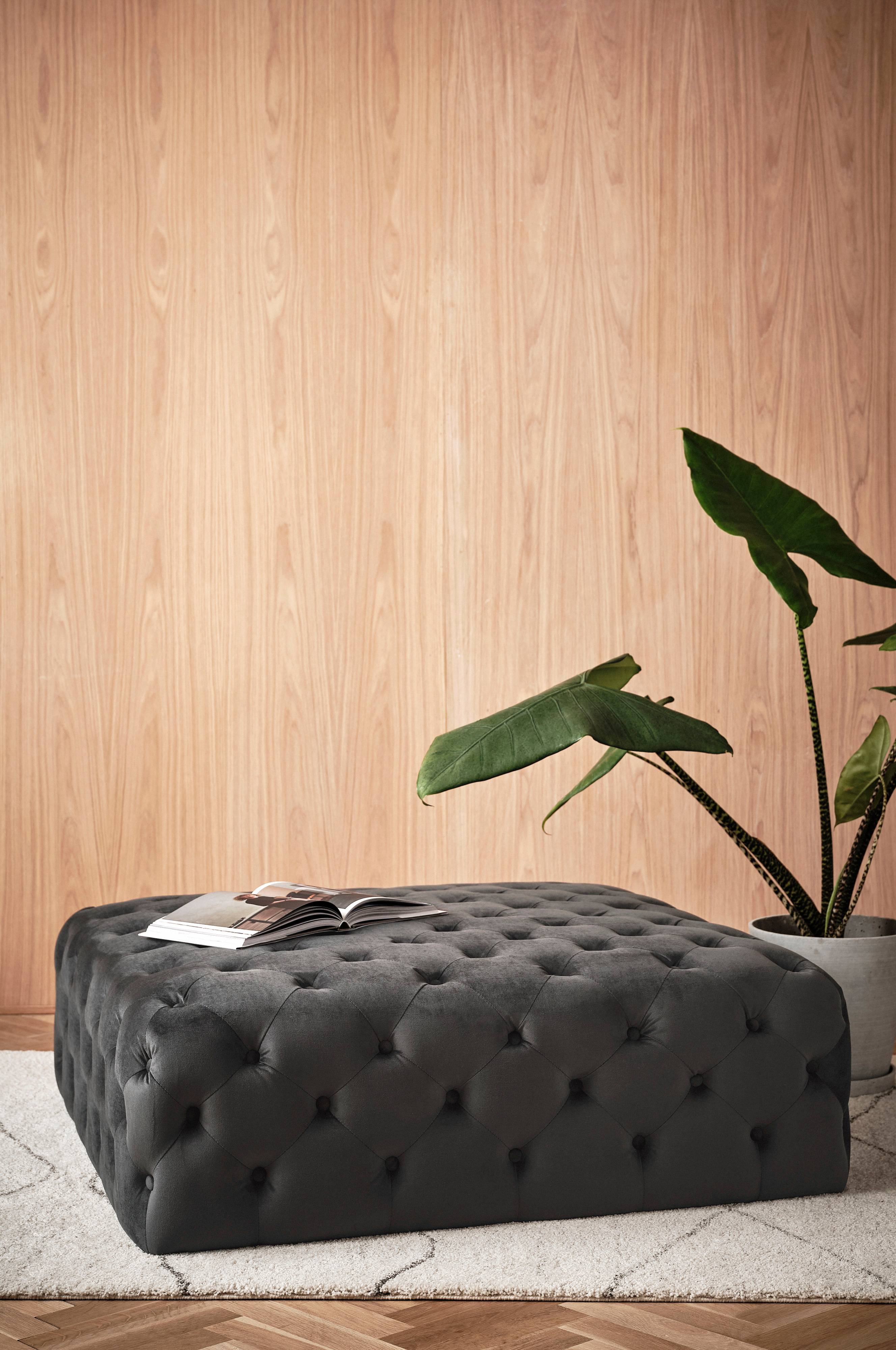 Fyrkantig sittpuff i sammet med djuphäftade och klädda knappar. Kombinationen zickzackfjädrar, resårkärna och skumgummifyllningen maximerar sittkomforten. En sittpuff kan vara en värdefull sittplats om gästerna blir många. Puffen är gjord i patchwork-teknik och sammet är ett tyg med kort lugg så de ser alltid lite olika ut beroende på hur ljuset faller. Det ger puffen en levande look. Tygets slitstyrka är på 28000 Martindale.