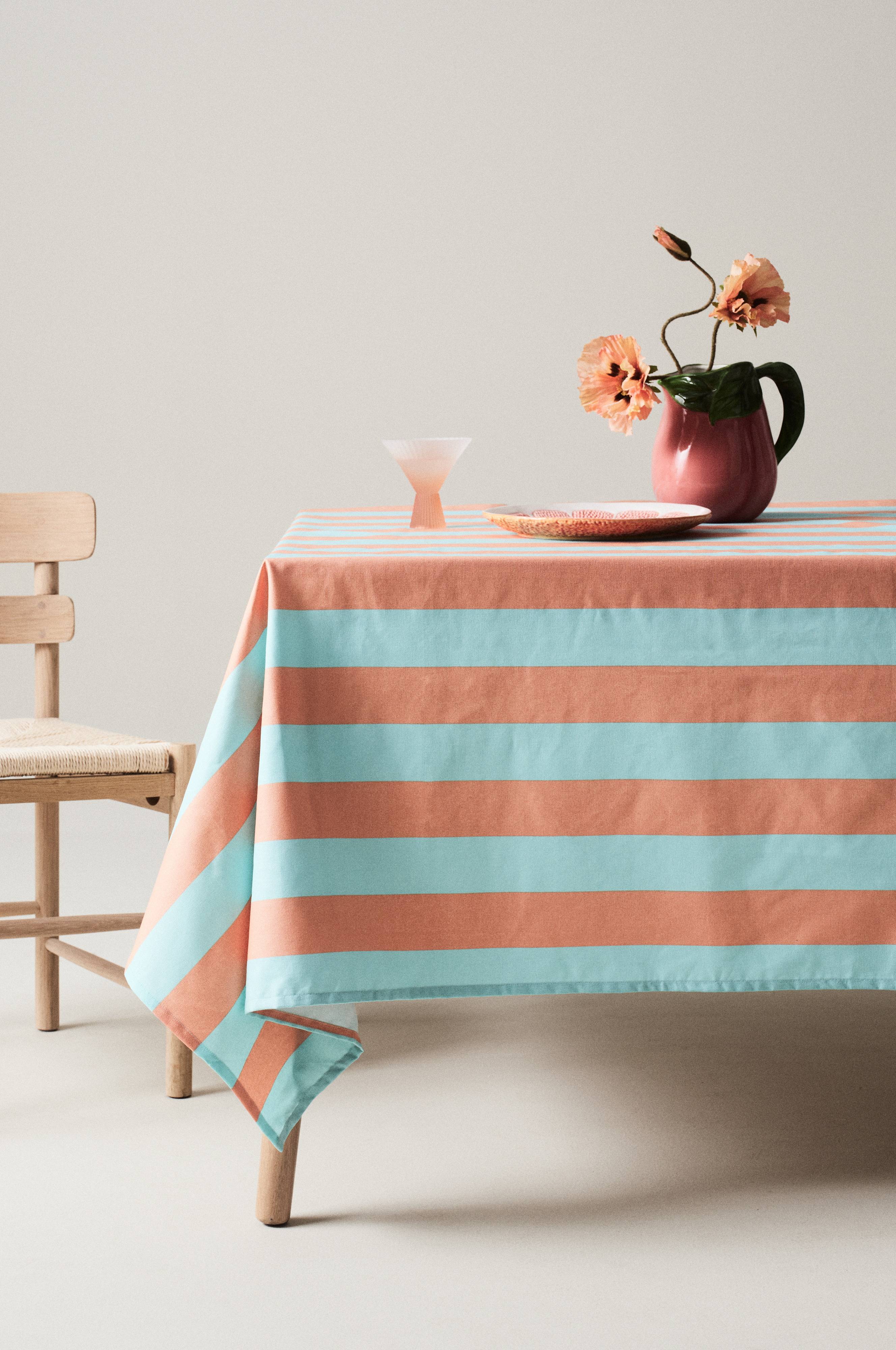 Duk med blockrandigt mönster i kontrastrika färger tryckt på vävt bomullstyg med akrylatbelagd baksida. Tygets utsida är behagligt matt och känns som vanligt tyg. Akrylatbehandlingen gör duken praktisk, tålig och vattenavvisande. Denna typen av duk är mycket praktisk utomhus och för barnfamiljer som vill skydda köksbordet och samtidigt duka fint.