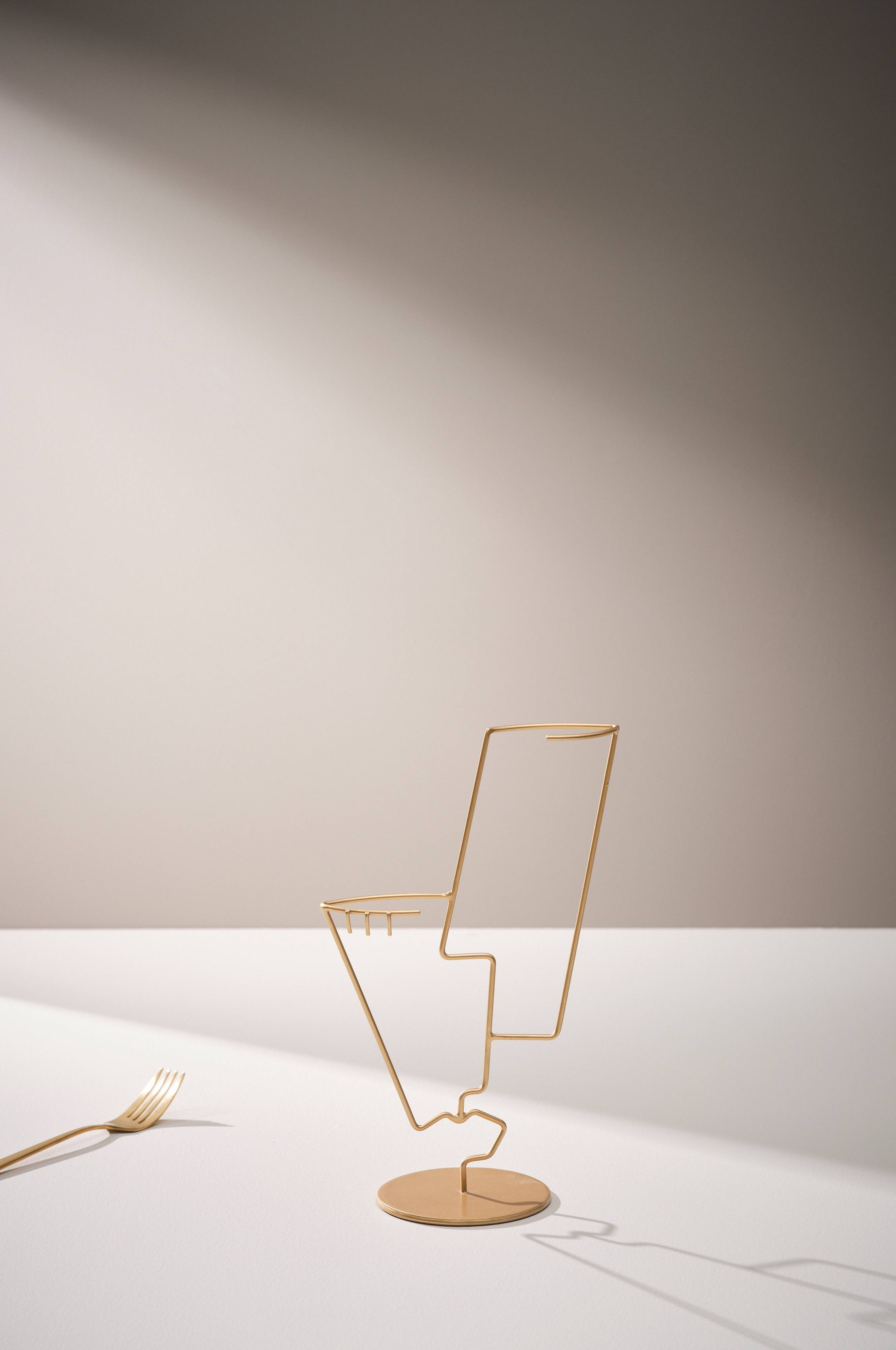 Dekoration i metalltråd som formats med kreativ känsla. JUMELLE är en stilfull, abstrakt skulptur som kan placerars stående på ett bord, i hyllan eller på fönsterbrädan. Kanske du associerar till ett människoansikte?
