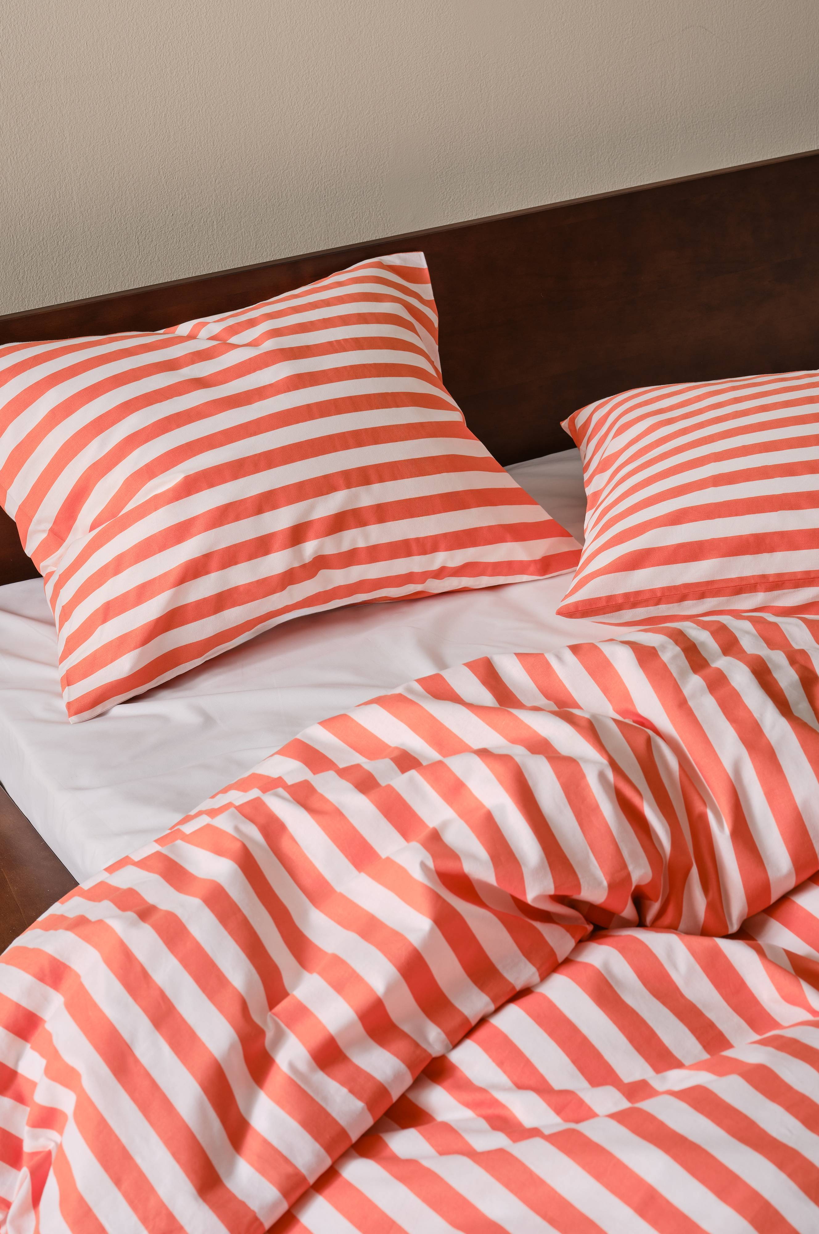 2-pack örngott av randig bomull. Den tvärgående randningen är tryckt i fräscha, somriga färger och på båda sidor av örngotten. Bomull är en mjuk och behaglig kvalité som känns sval mot huden. Trådtäthet på 144 tc. (Trådtätheten talar om antalet trådar, thread counts, per kvadrattum i ett tyg. Ju högre trådtäthet desto högre kvalité. Med undantag för linne som ofta vävs glesare för att få den rätta känslan.)