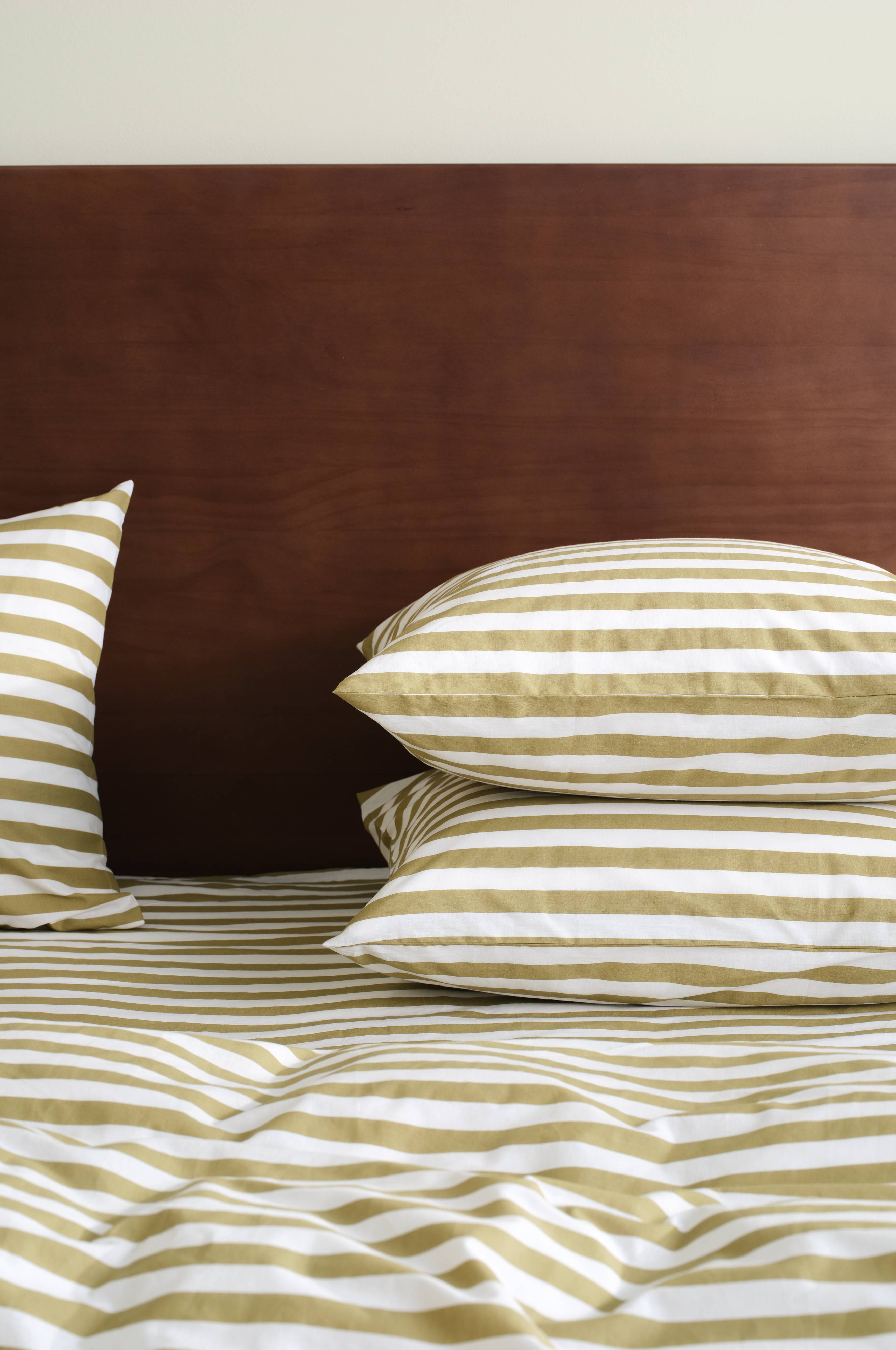 2-pack örngott av randig bomull. Den tvärgående randningen är tryckt i fräscha, somriga färger och på båda sidor av örngotten. Bomull är en mjuk och behaglig kvalité som känns sval mot huden. Trådtäthet på 144 tc. (Trådtätheten talar om antalet trådar, thread counts, per kvadrattum i ett tyg. Ju högre trådtäthet desto högre kvalité. Med undantag för linne som ofta vävs glesare för att få den rätta känslan.)