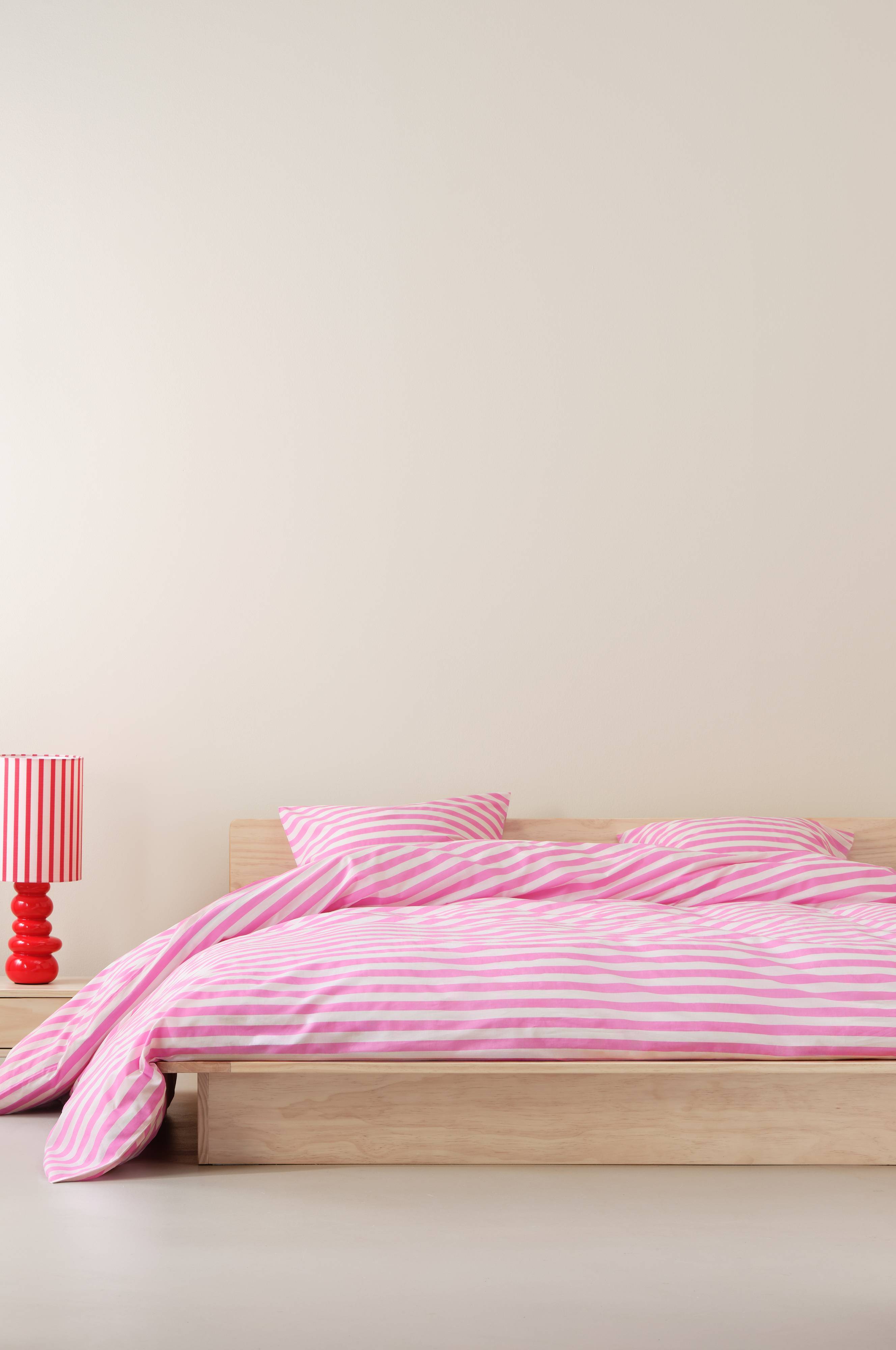 Randigt påslakanset i tre delar, ett extra brett påslakan och två örngott av bomull. Den tvärgående randningen är tryckt i fräscha, somriga färger och på båda sidor av örngott och påslakan. Bomull är en mjuk och behaglig kvalité som känns sval mot huden.