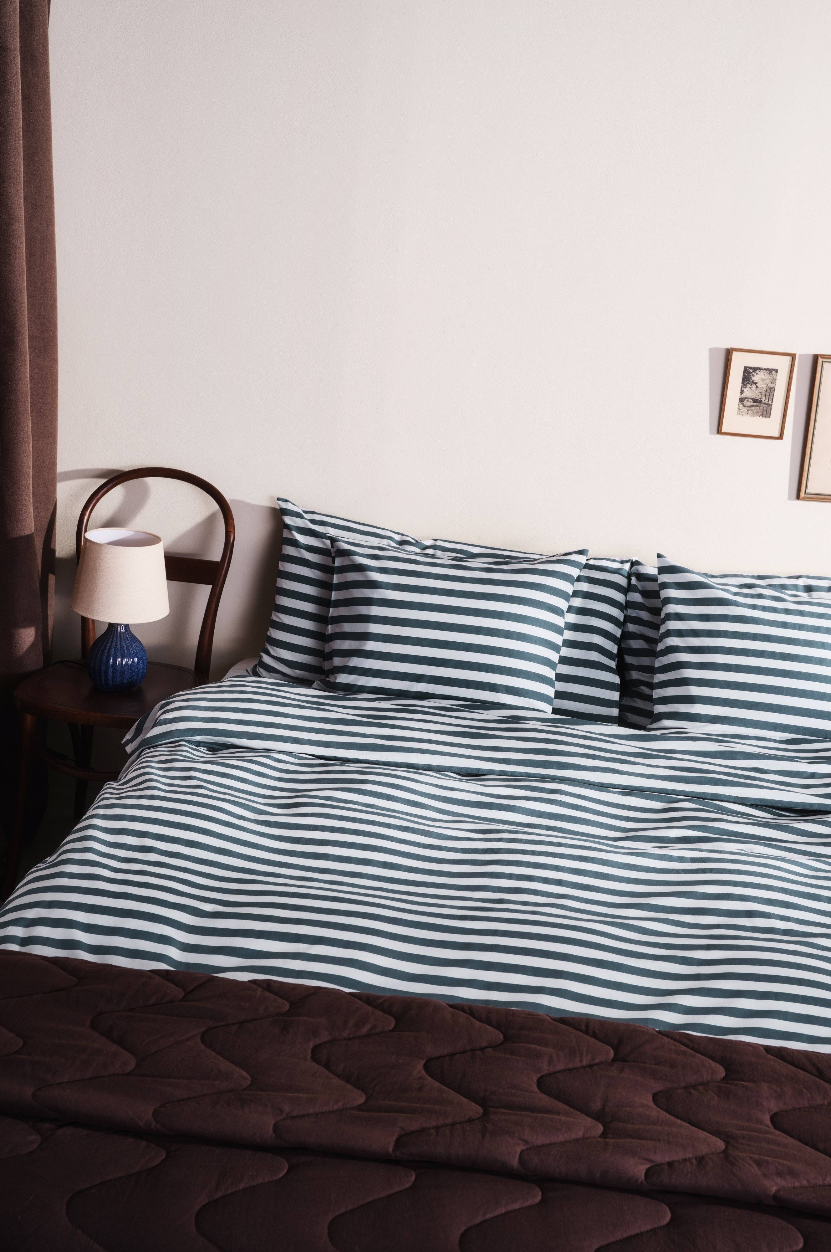 Randigt påslakanset i tre delar, ett extra brett påslakan och två örngott av bomull. Den tvärgående randningen är tryckt i fräscha, somriga färger och på båda sidor av örngott och påslakan. Bomull är en mjuk och behaglig kvalité som känns sval mot huden.