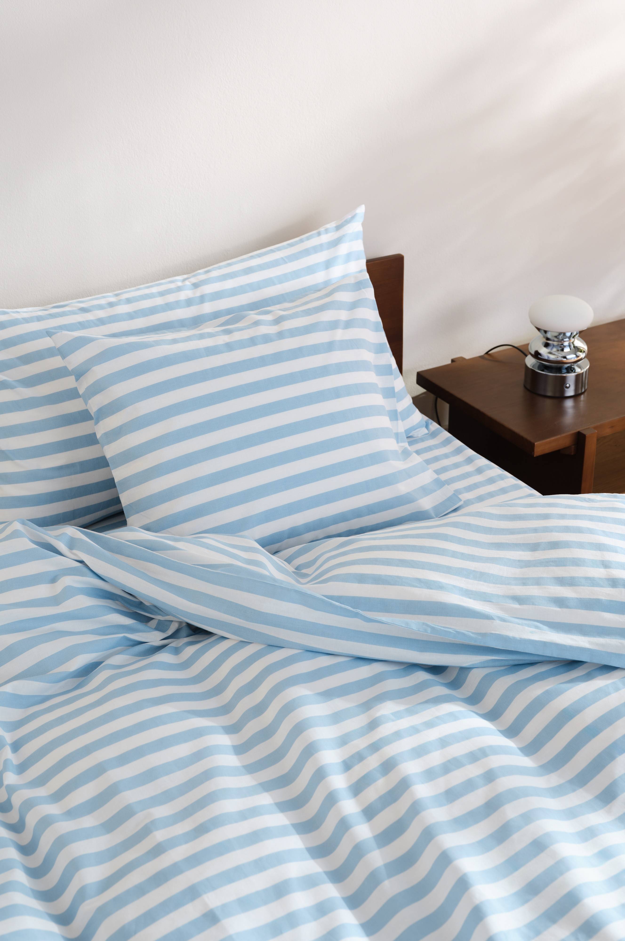 Randigt påslakanset i två delar, ett påslakan och ett örngott av bomull. Den tvärgående randningen är tryckt i fräscha, somriga färger och på båda sidor av örngott och påslakan. Bomull är en mjuk och behaglig kvalité som känns sval mot huden. Öppning i övre hörnen på påslakanet, som underlättar att trä påslakanet över täcket. Trådtäthet på 144 tc. (Trådtätheten talar om antalet trådar, thread counts, per kvadrattum i ett tyg. Ju högre trådtäthet desto högre kvalité. Med undantag för linne som ofta vävs glesare för att få den rätta känslan.)