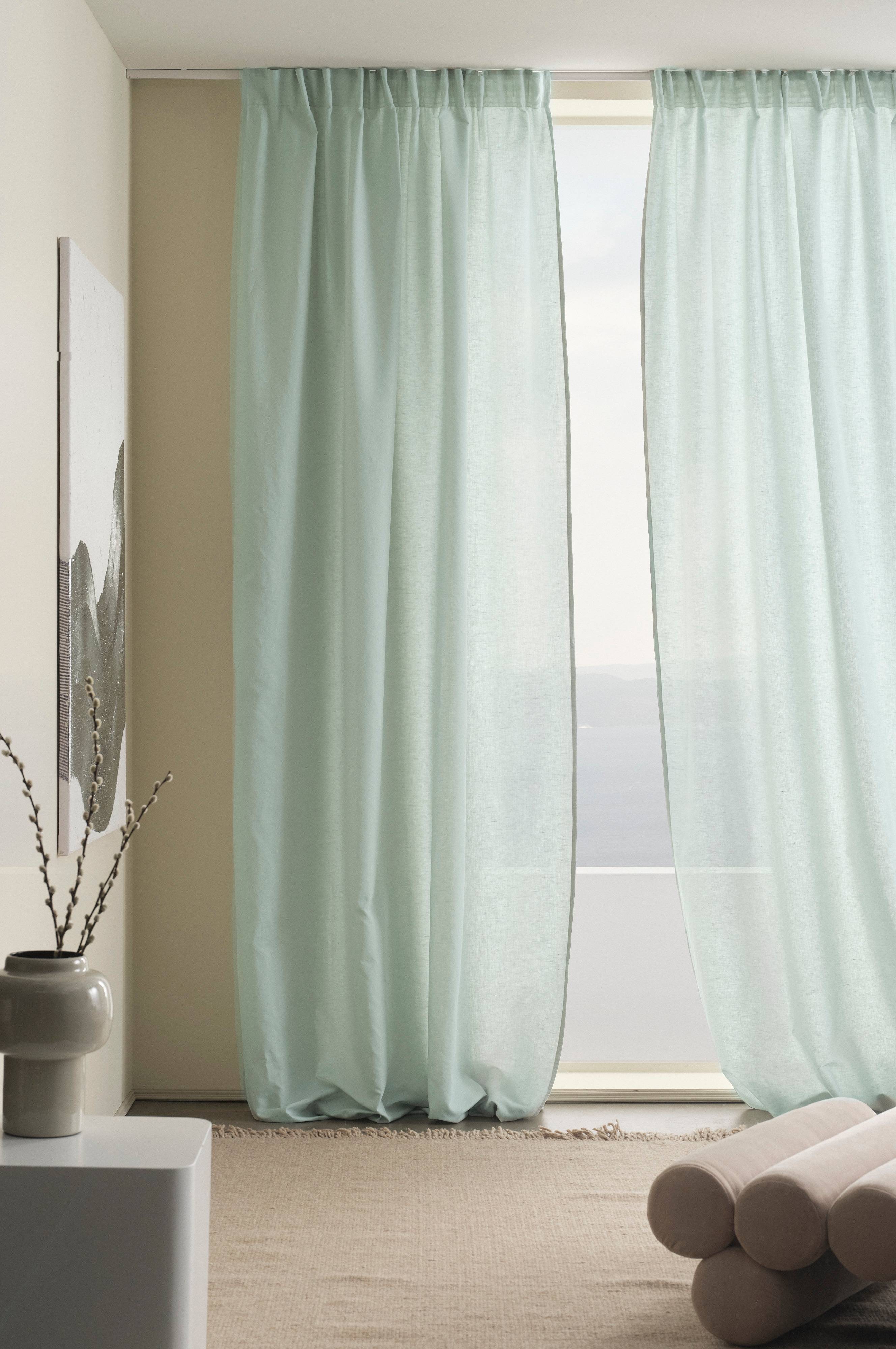 Två gardinlängder i fin linnemix där linet blandats med bomull. Blandningen av bomull och lin ger en lättskött kvalité med fördelar från både bomull och lin. Linet för med sig den lite fastare strukturen och tillsammans med den mjuka bomullen blir tyget följsamt och faller fint. Längderna har påsytt multifunktionsband och kan hängas upp med fingerkrokar eller dold hälla. Enfärgat är lätt att matcha och passar lika bra till enfärgad textil i matchande färger som till mönstrat. .
