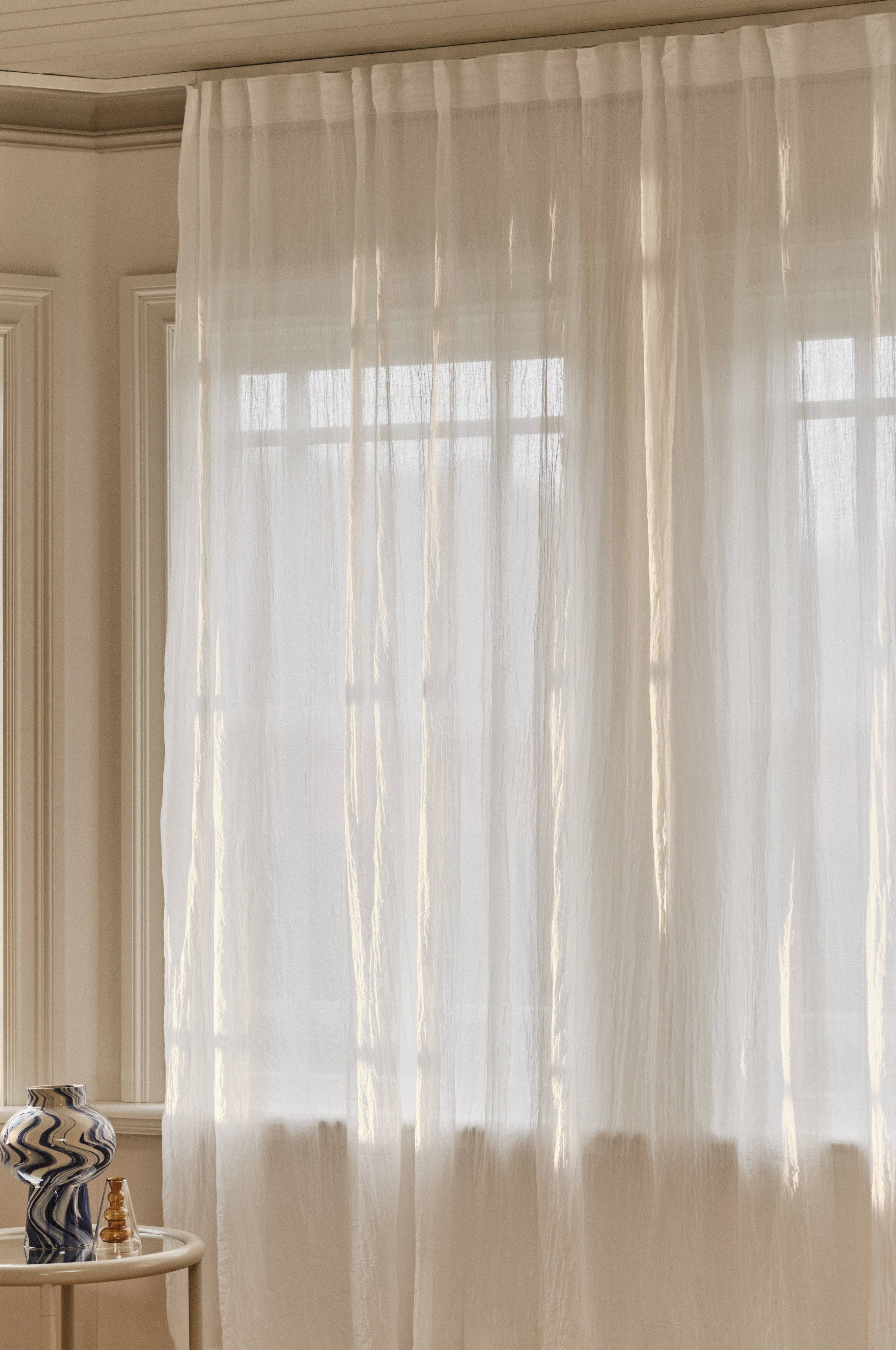 En extra bred gardinlängd i skir och luftig kvalité av polyester/bomull som faller lätt. Med påsytt multifunktionsband. Gardinen kan hängas upp med fingerkrokar, kanal samt dold hälla.