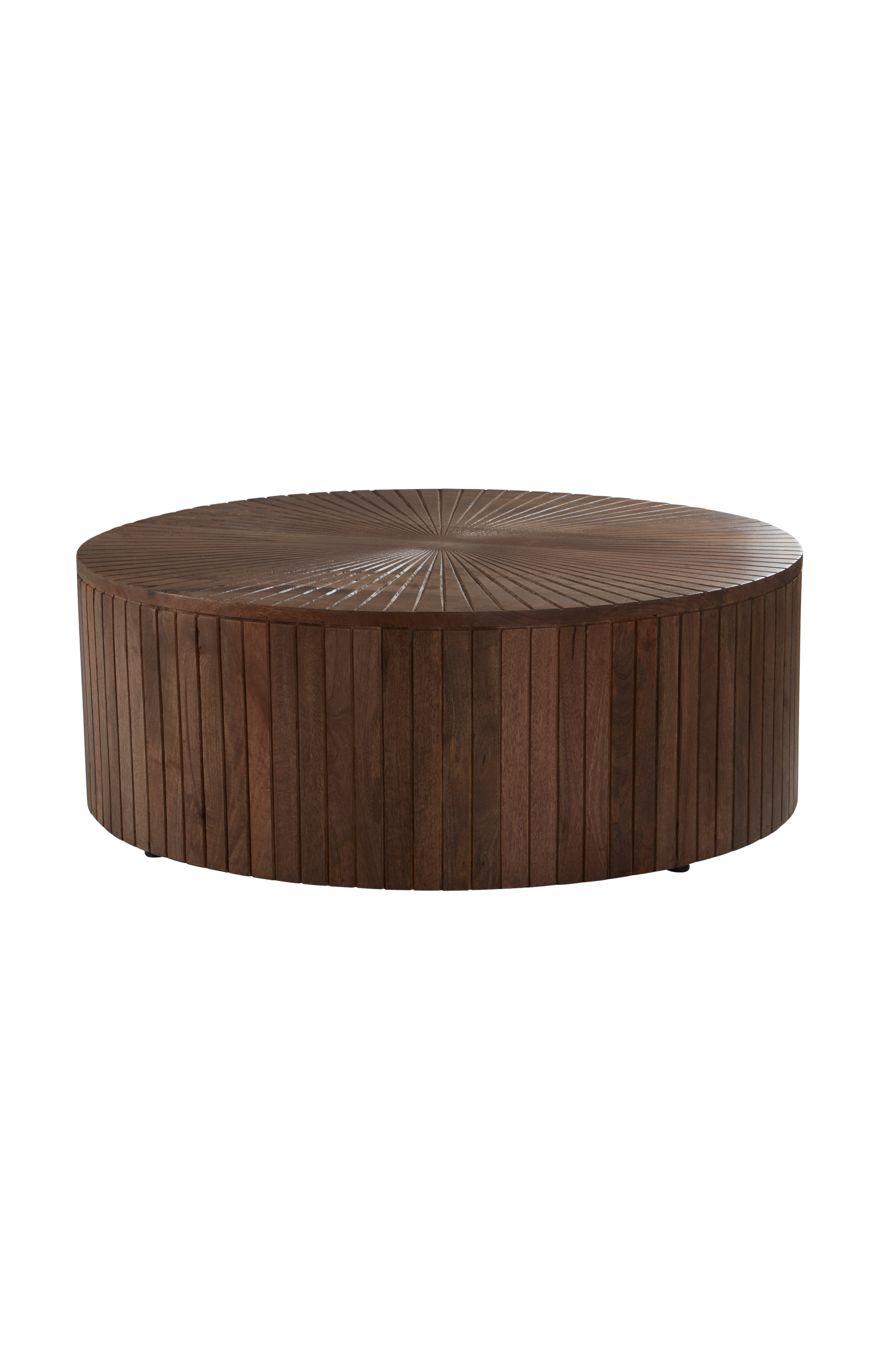 Runt soffbord i en rustik design. Bordsskivan har en lätt räfflad yta som ger en industriell känsla till ditt hem.