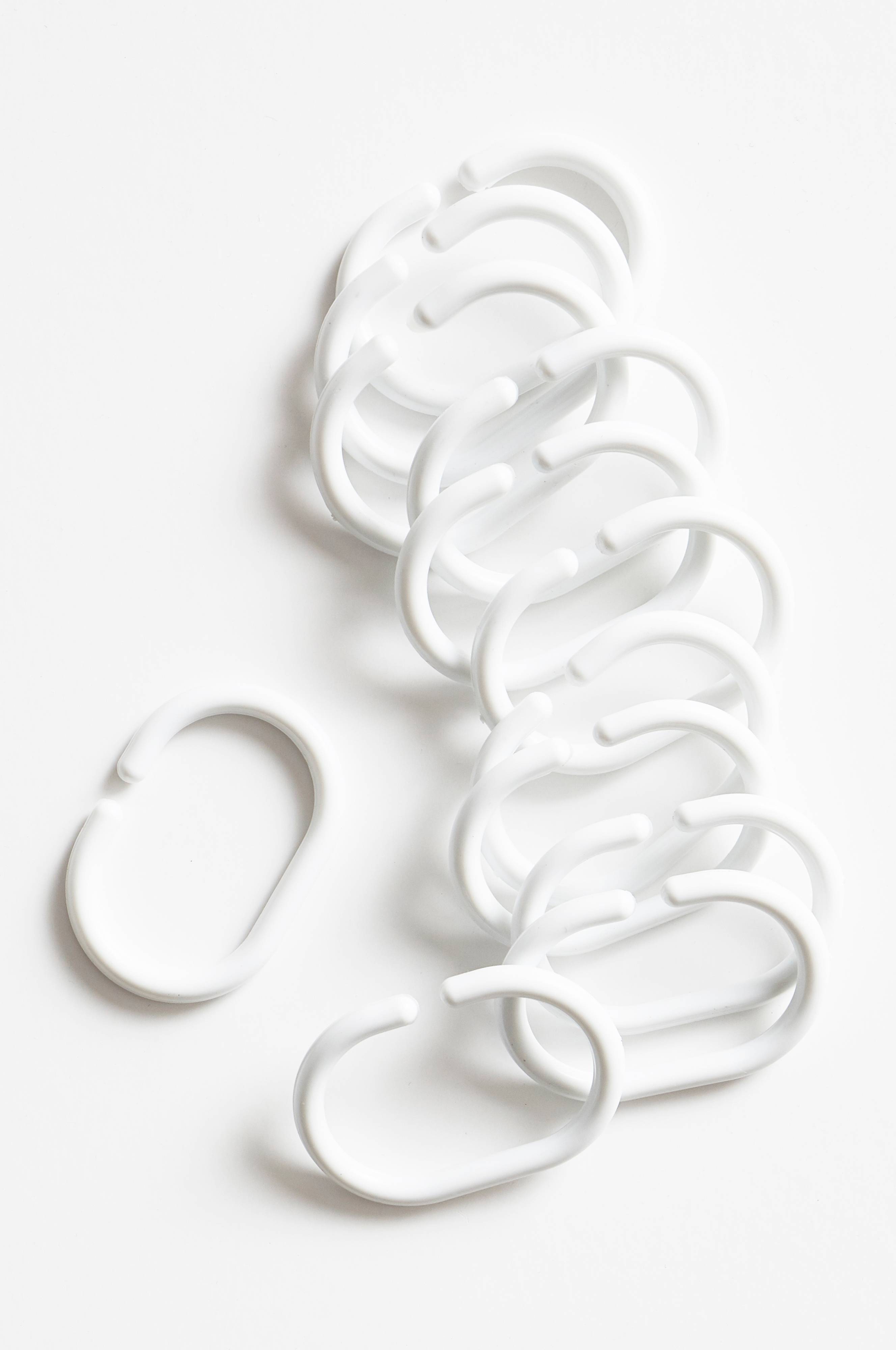 12-pack duschdraperiringar av plast. C-formen gör det enkelt att hänga upp duschdraperiet på stången.