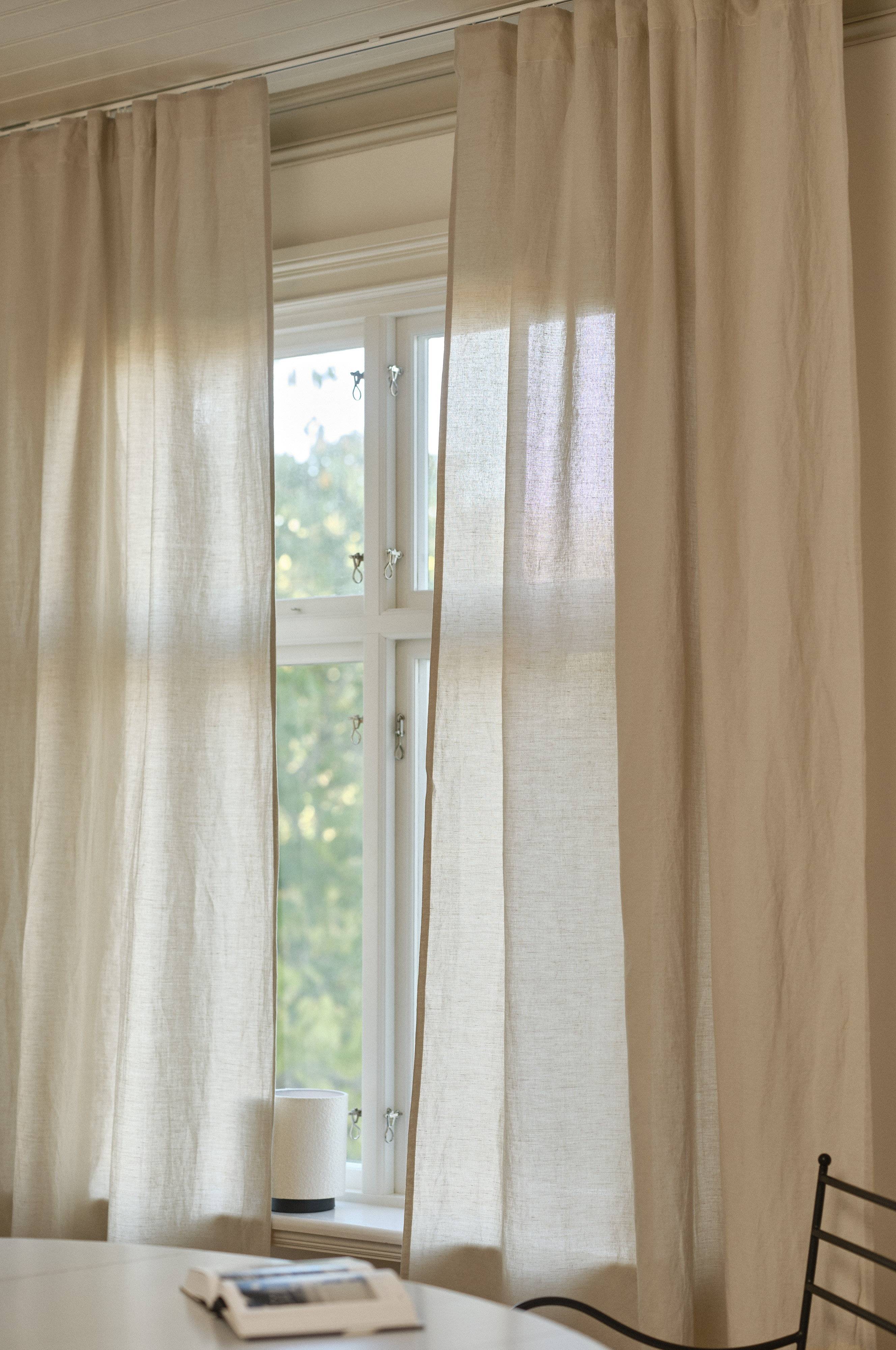Gardinens längd kan variera något vid leverans, då naturmaterial som lin påverkas mer av till exempel temperatur än syntetmaterial. En variation på 1-2 cm från angivet mått är helt naturlig.