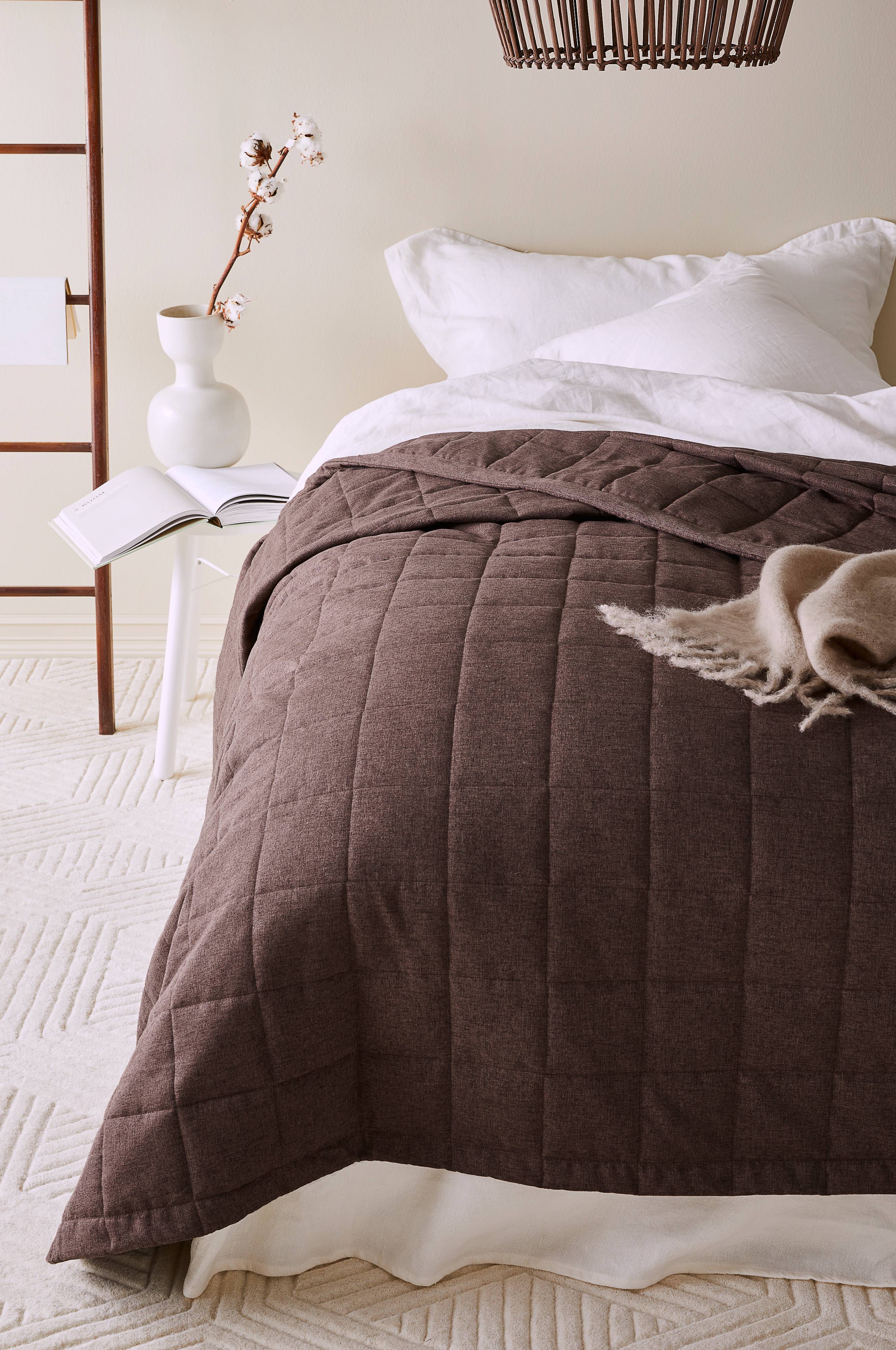 Enfärgat överkast för enkelsäng i mjuk polyester med fin struktur som ger en härlig linnekänsla. LINDEN överkast är quiltat i dekorativa fyrkanter. Fyllning av polyester 80 g/m².