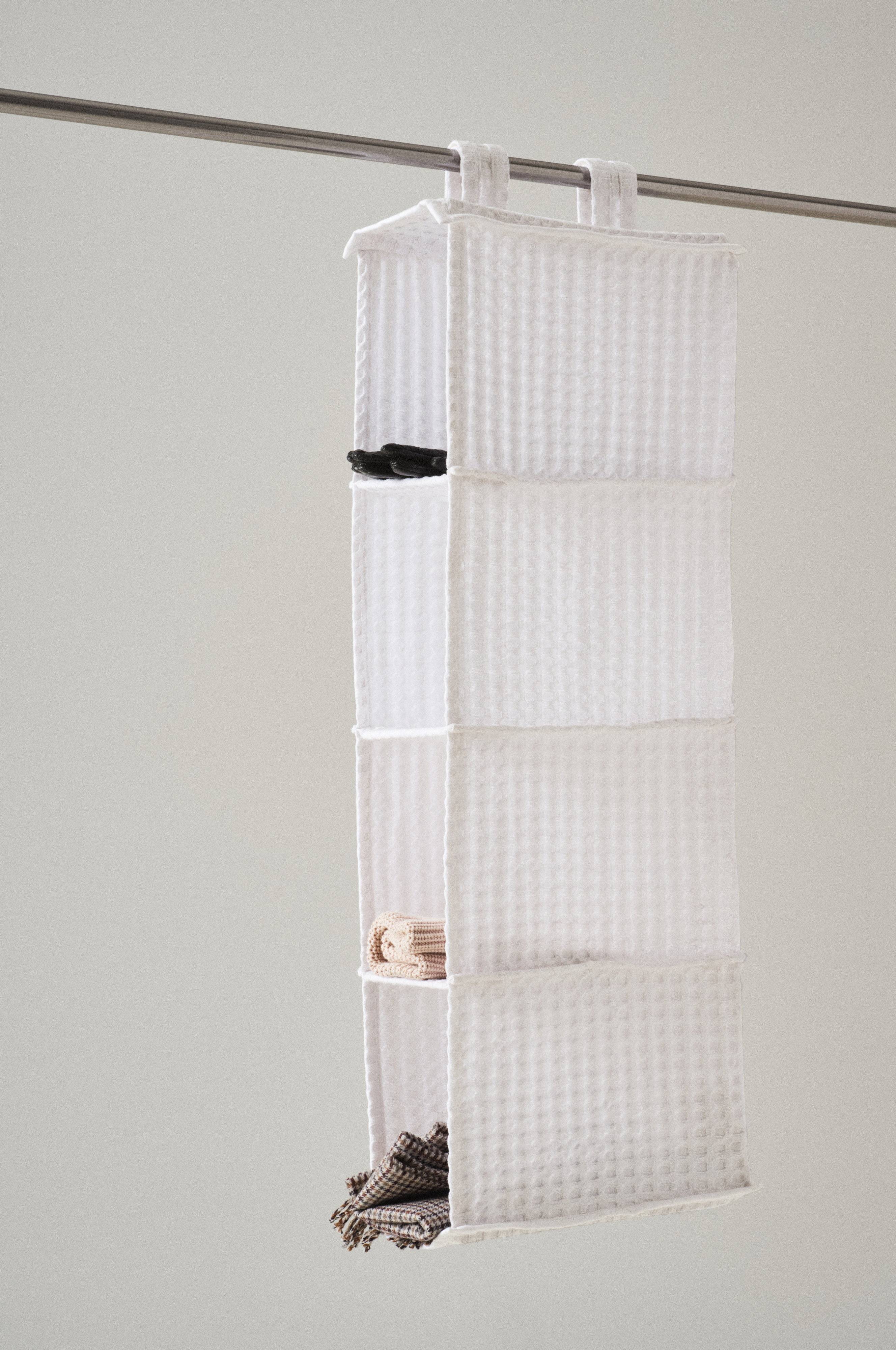 Garderobsförvaring av bomull med fyra fack för till exempel skor. Tyget har vävd våffelstruktur. Upptill har förvaringen två hällor med kardborrelås, så du enkelt kan hänga upp den runt en klädstång, en galge eller en rundstav. De fyra facken är förstärkta med kartong för att göra dem extra stabila. Garderobsförvaringen är också perfekt i hallen, i barnkammaren och överallt där du behöver lite extra förvaring.