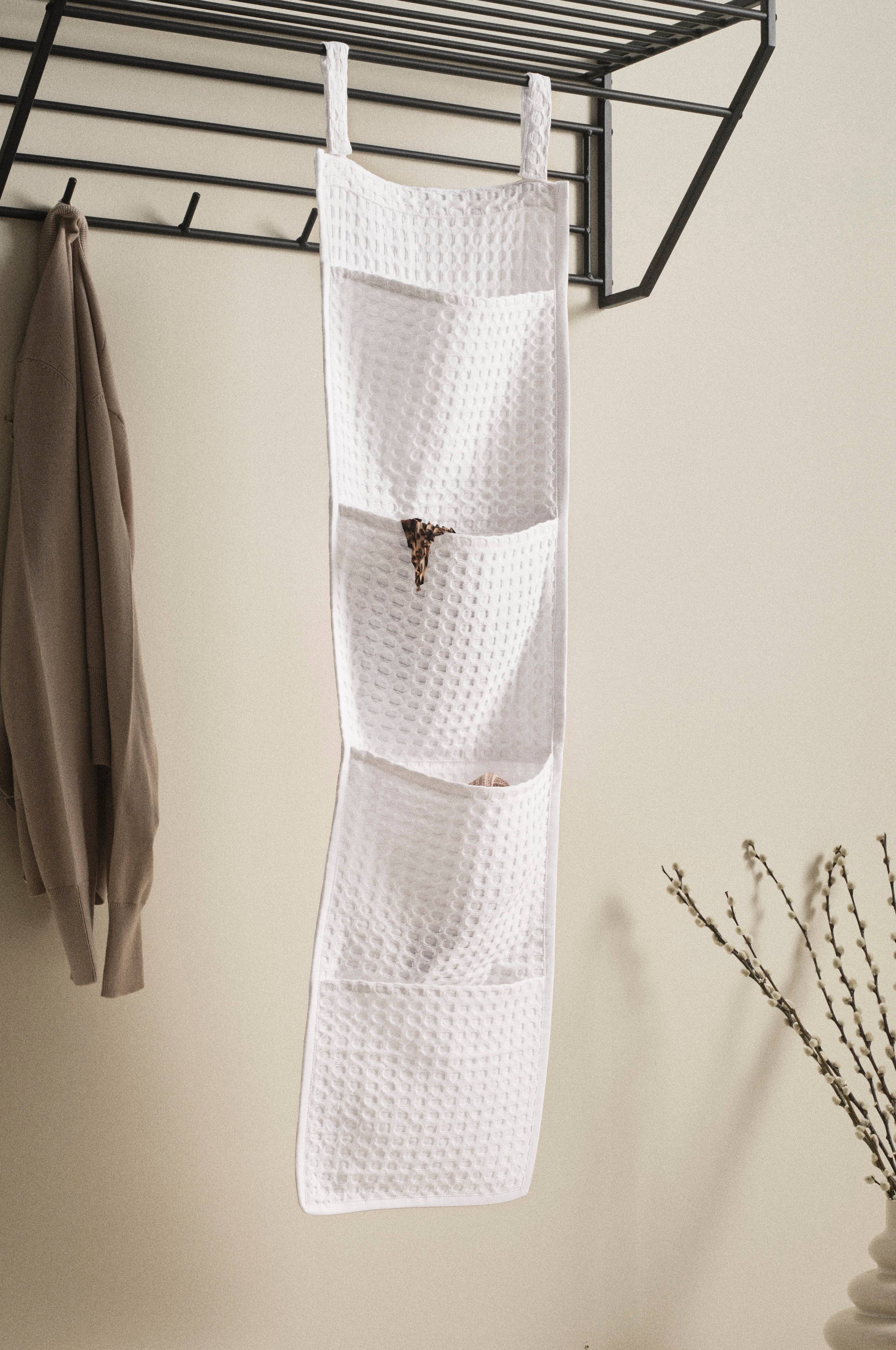 Hängande förvaring av bomull med vävd våffelstruktur. Förvaringen är försedd med fyra praktiska fickor. Upptill har den två hällor med kardborrelås, så du enkelt kan hänga upp den runt en klädstång, en galge eller en rundstav. Förvaringsfickorna är perfekta i hallen, i barnkammaren och överallt där du behöver lite extra förvaring.
