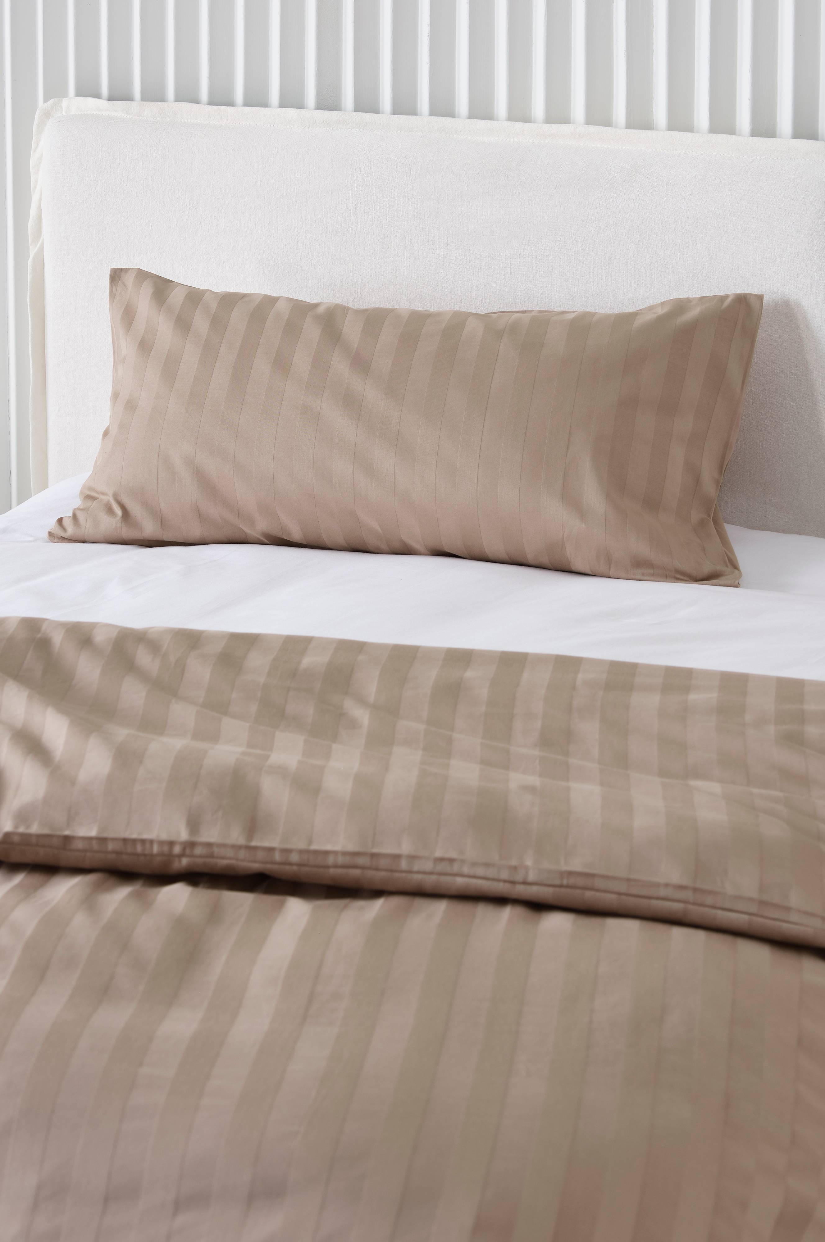 1-pack enfärgat örngott i satin av bomull med vävda ränder ton-i-ton. Satin är en vävteknik som ger ett underbart slätt, mjukt och lent tyg. Bomull som vävs med denna teknik ger ett tyg med fin lyster och lyxig känsla. Sängkläder i satin passar dig som önskar en lyxig sovupplevelse, precis som på hotell fast hemma! Trådtäthet på 215 tc. (Trådtätheten talar om antalet trådar, thread counts, per kvadrattum i ett tyg. Ju högre trådtäthet desto högre kvalité).