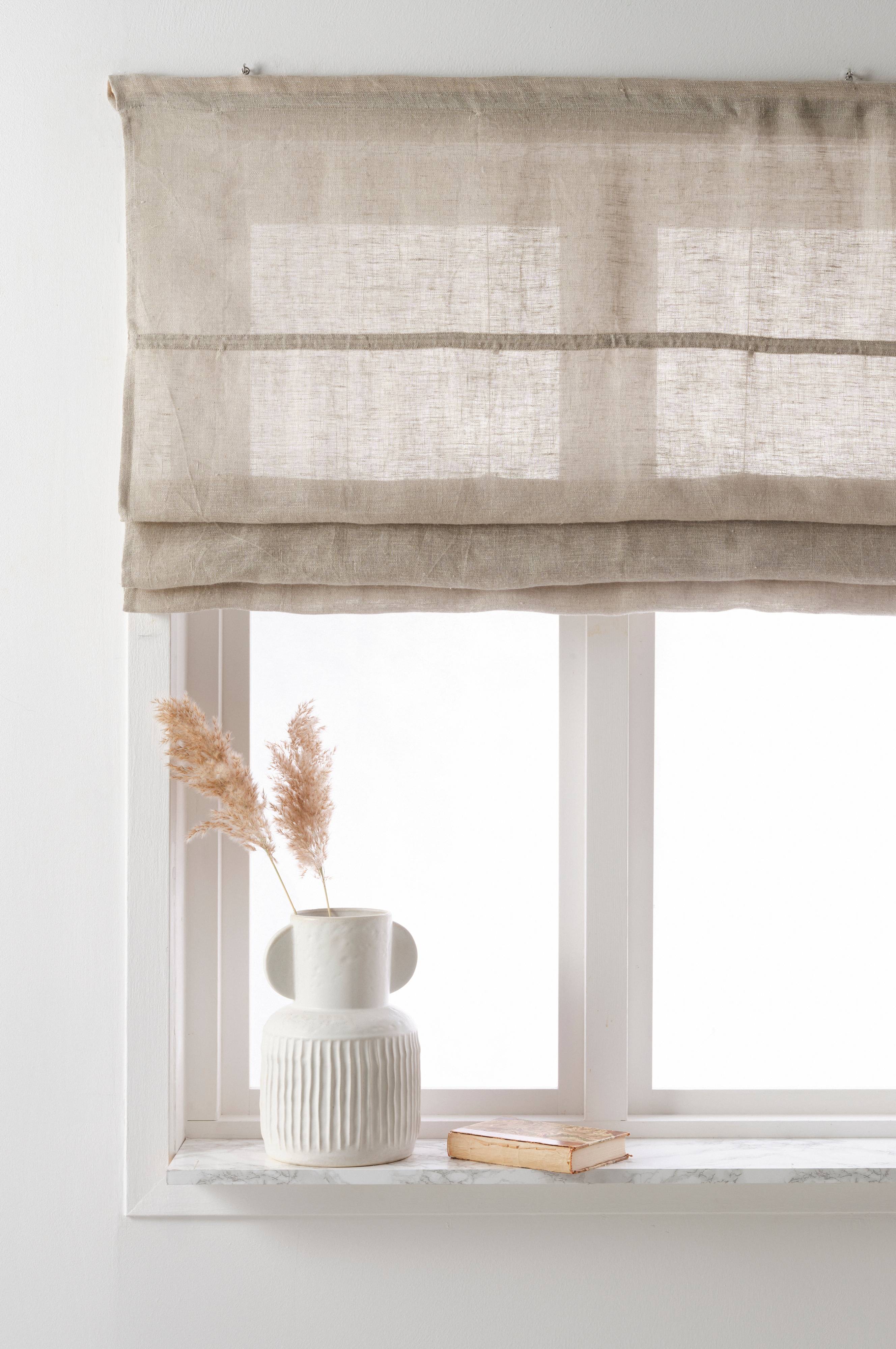 Hissgardin av äkta lin. Hissgardinen är enfärgad och linnetyget ger rustik känsla. Enkel uppsättning med hissfunktion. Kan hängas på vanlig gardinstång.
