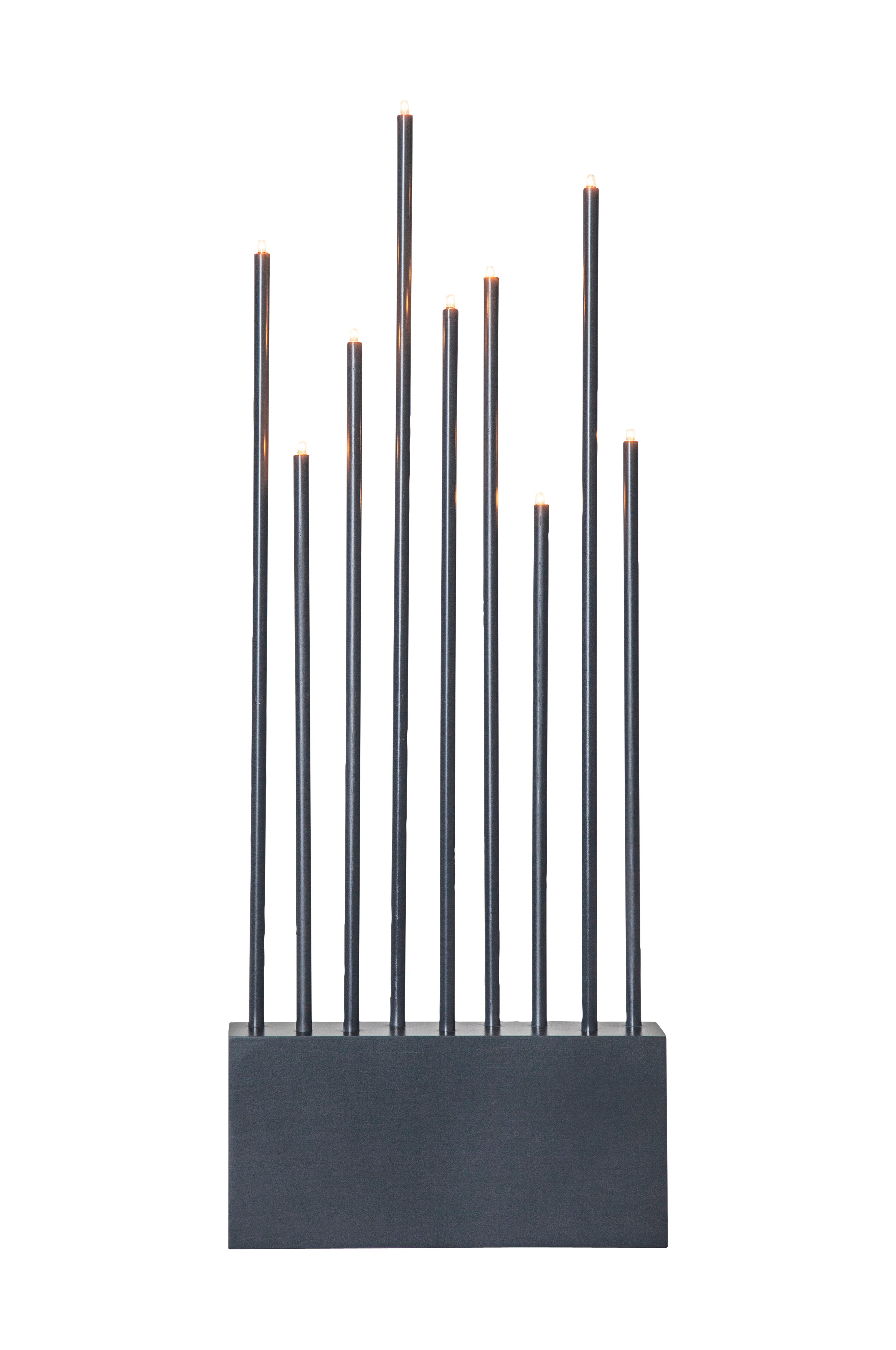 Stilren ljusstake med kraftig träbas, ljuspipor av tunna metallrör. 9 st ljuskällor, E5 lampor, ingår. Hela ljusstaken i grafit. Färgad textilkabel med strömbrytare. Ger ett härligt stämnigsfullt ljus hela året runt. Lampans spänning 12V. Volt 12V.