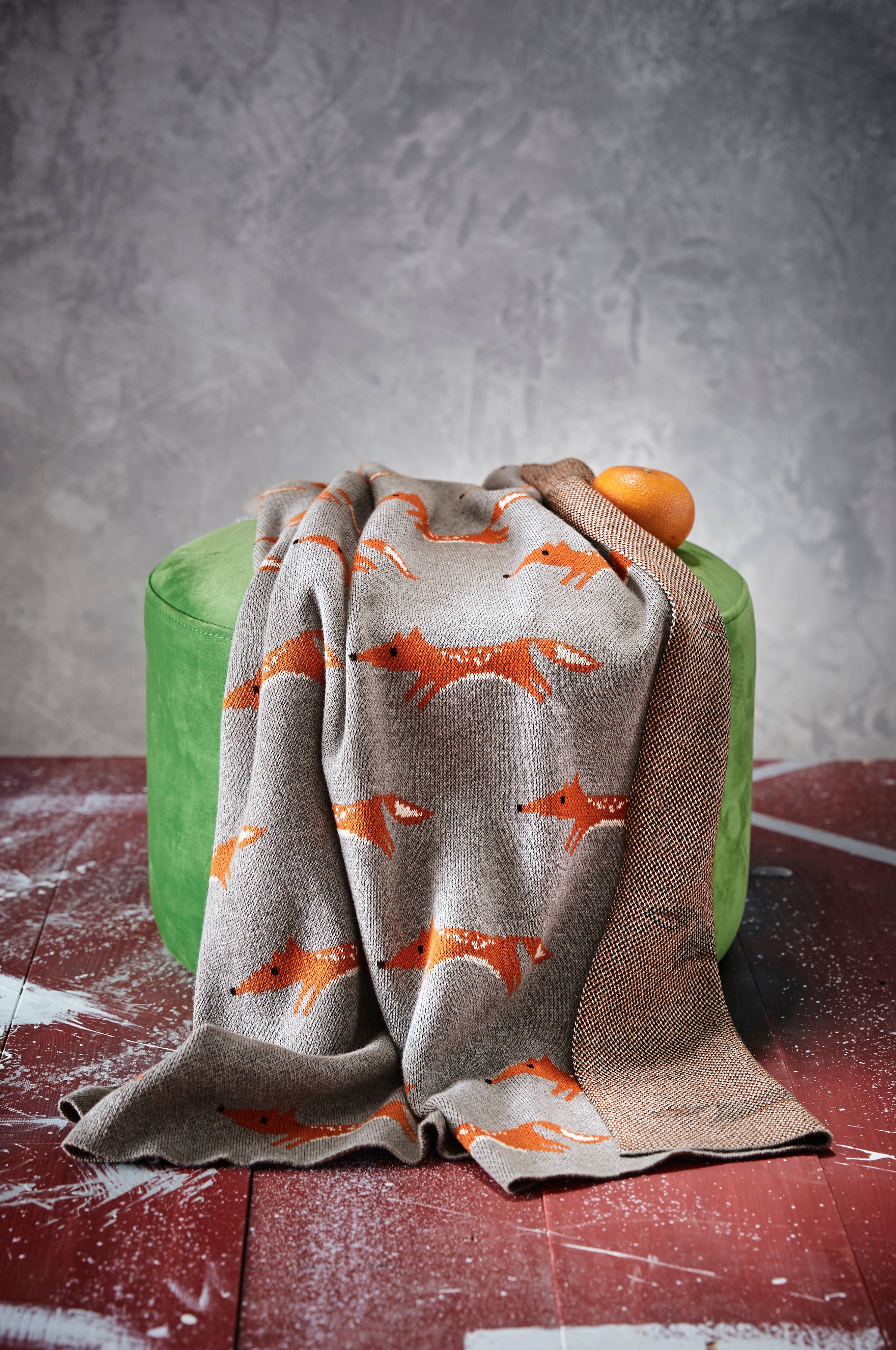 En mysig och mjuk stickad babyfilt i ekologiskt bomull med små dekorativa rävar. Passar perfekt att ha i barnvagnen och spjälsängen.