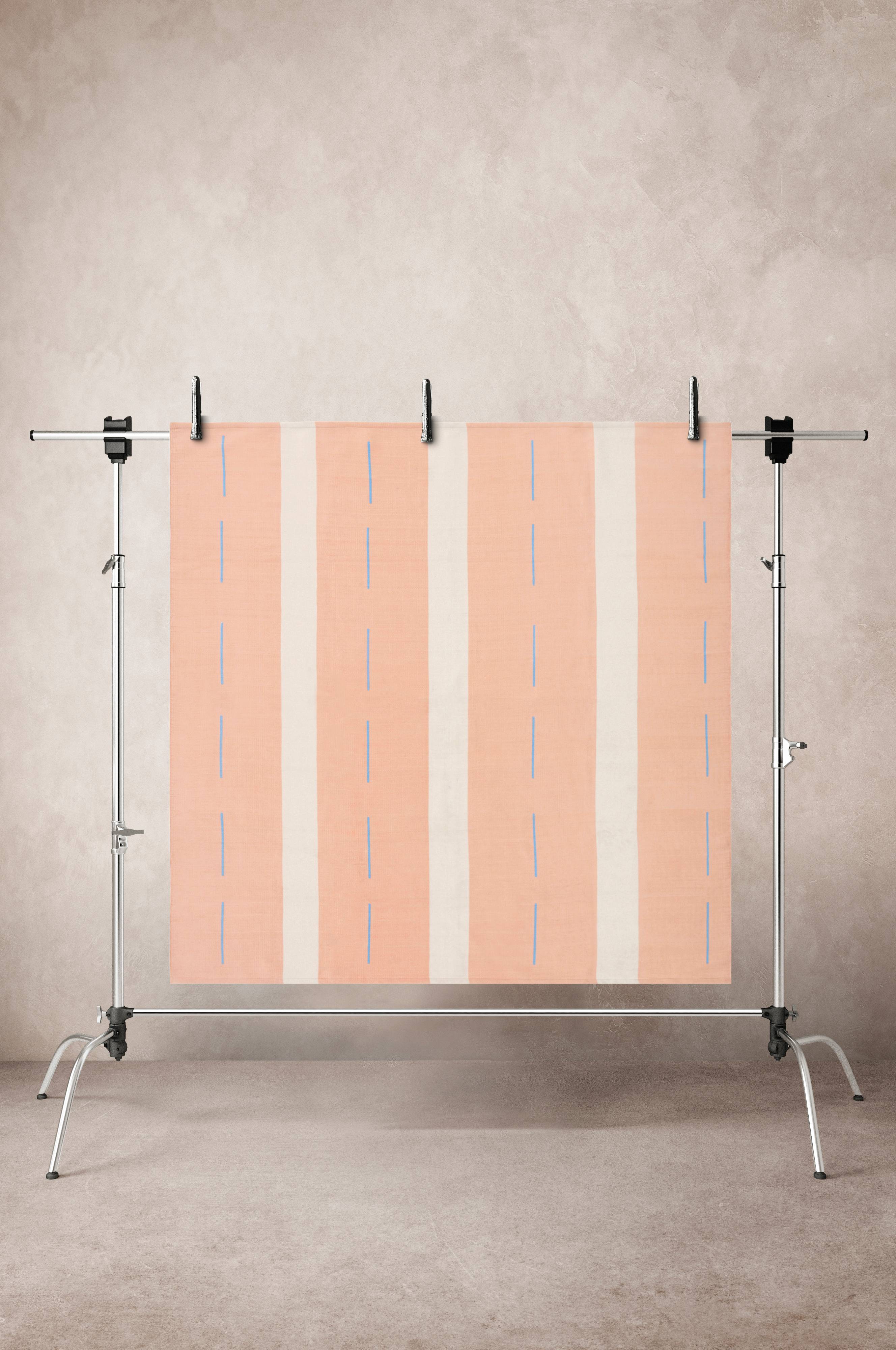 Slätvävd matta som är handvävd och har tryckt randmönster. Denna matta är tunn, och tanken är att den kan användas som en strandmatta eller picknickmatta. Den fungerar förstås också inomhus och är lätt att flytta och ruska, praktiskt i en hall till exempel. Mattan är tillverkad av polyester som framställts av återvunnet material och som är perfekt att användas utomhus. Den tål att bli blöt utan att mögla, en fantastisk fördel hos materialet. Tjocklek 0,6-0,7 cm. 650-700 g/m².