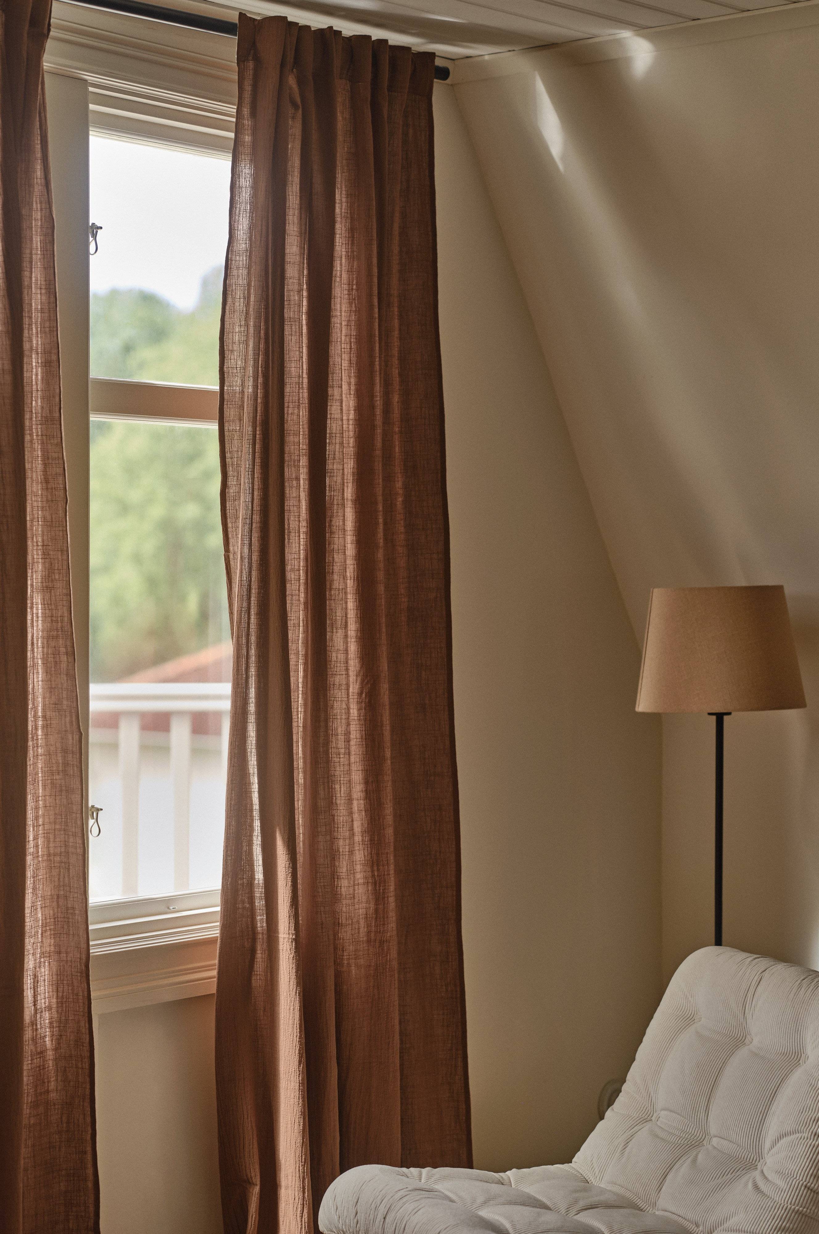 Två gardinlängder i luftigt tyg med melerad effekt. Tyget är vävt i bomull och har en skönt avslappnad känsla. LUNI har påsytt multifunktionsband och gardinen kan hängas upp med fingerkrokar, kanal samt dold hälla. Tygets gramvikt 105 g/m².