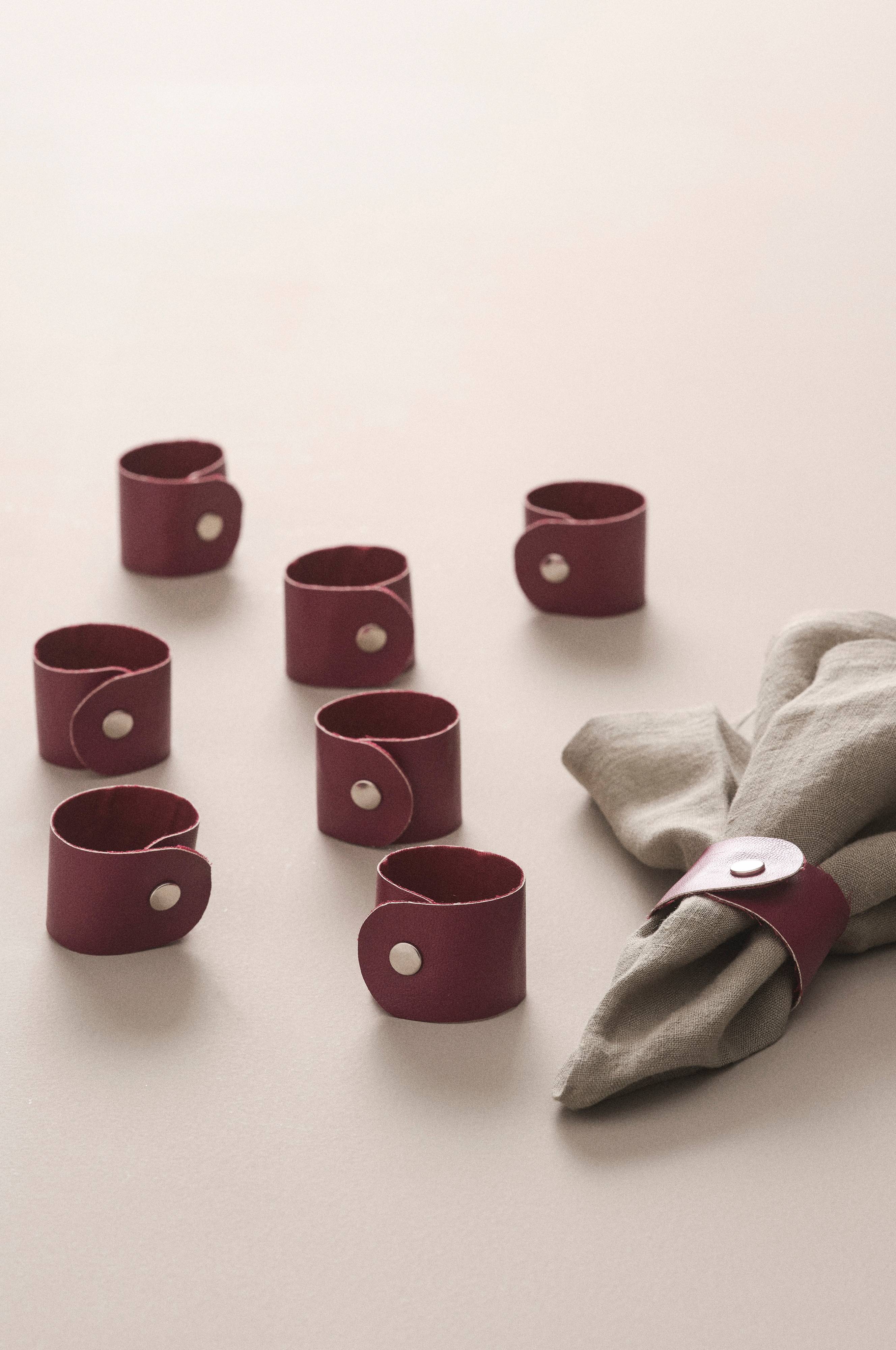 8-pack servettringar i konstläder av polyuretan. Servettringen stängs med en tryckknapp och ger en festlig dukning.