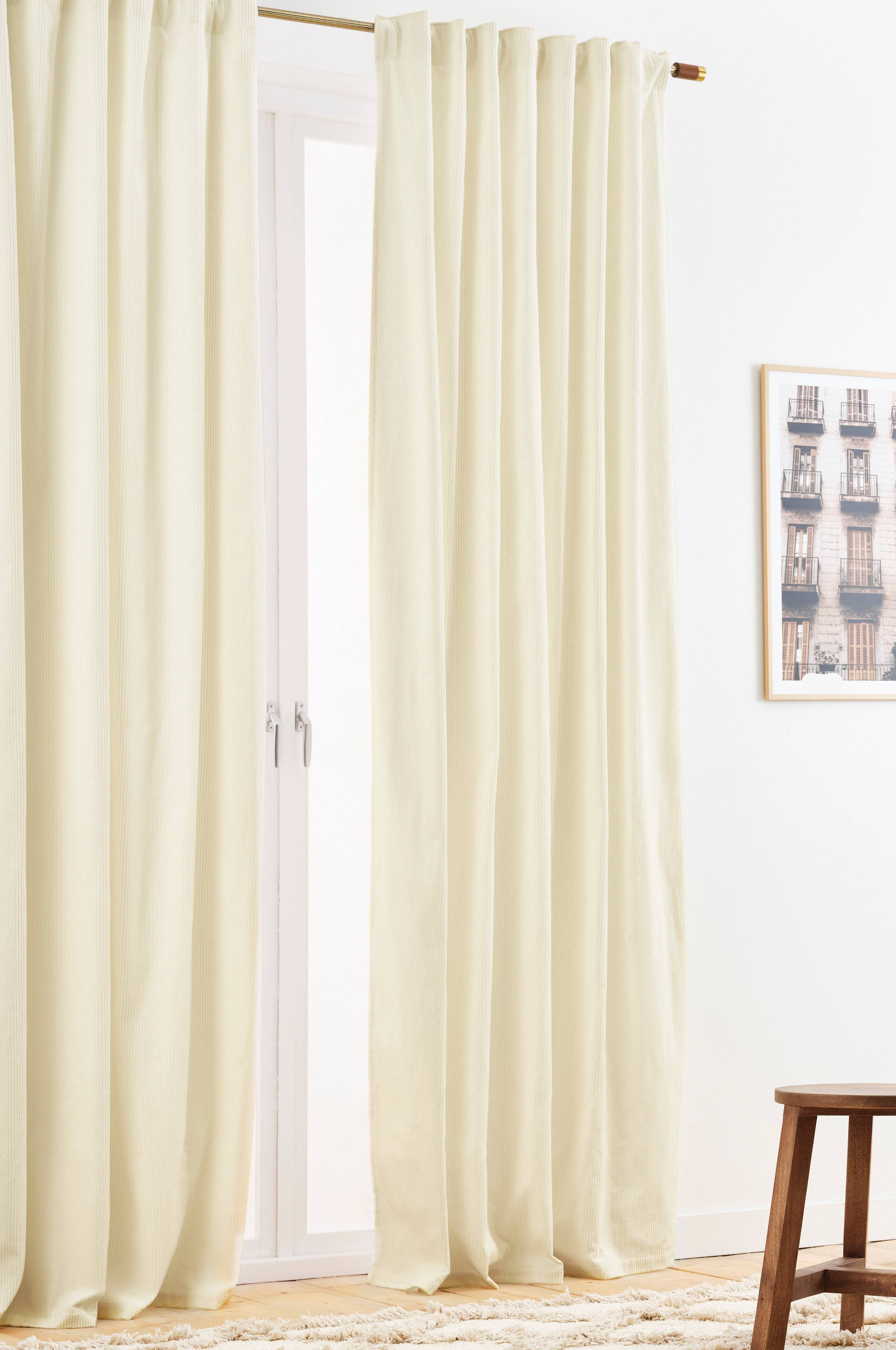 Två gardinlängder i manchester av bomull, ett härligt tyg som är trendigt och samtidigt kan väcka härlig nostalgi. Manchestern är bredspårig och längderna får tyngd och faller fint. Längderna har påsytt multifunktionsband och kan hängas upp med fingerkrokar, kanal samt dold hälla.
