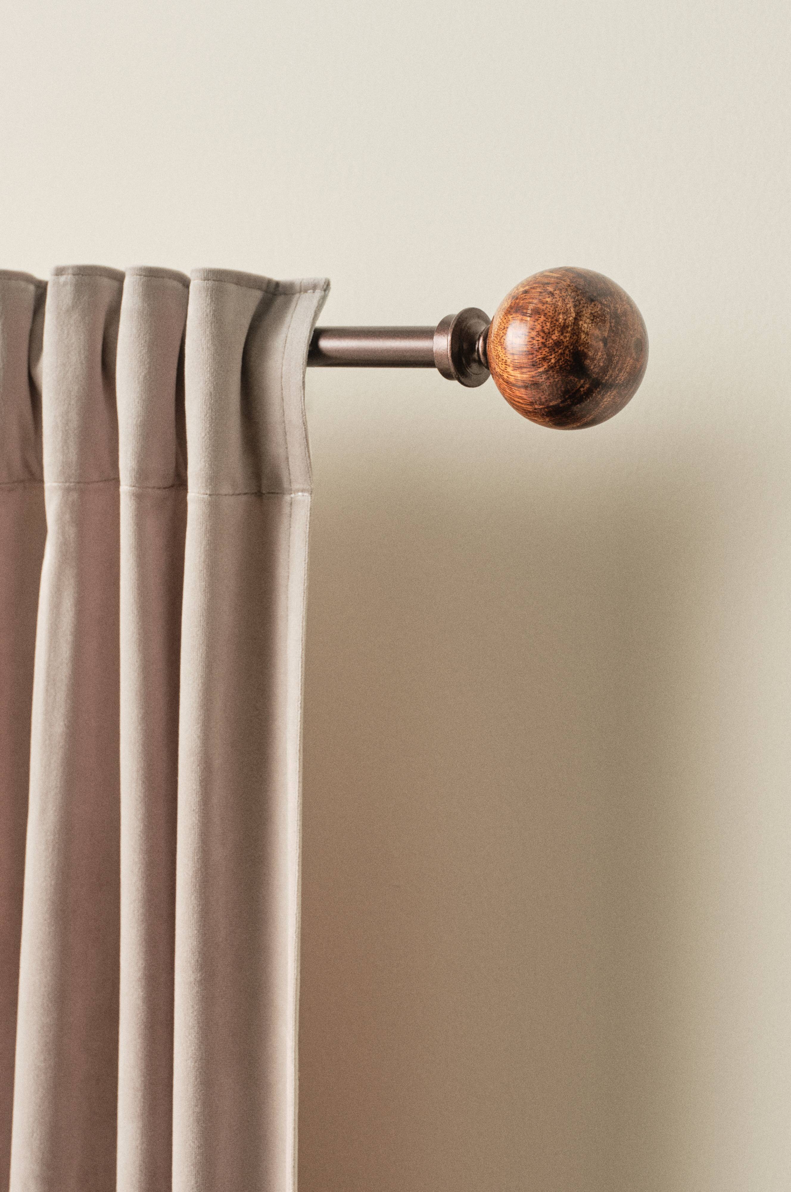 Gardinstång av stål med runda, fina ändknoppar. Vacker marmorerad färg som framställts genom att ytan gnuggats med olja. Ändknopparna trycks på gardinstången. 3 väggfästen ingår.