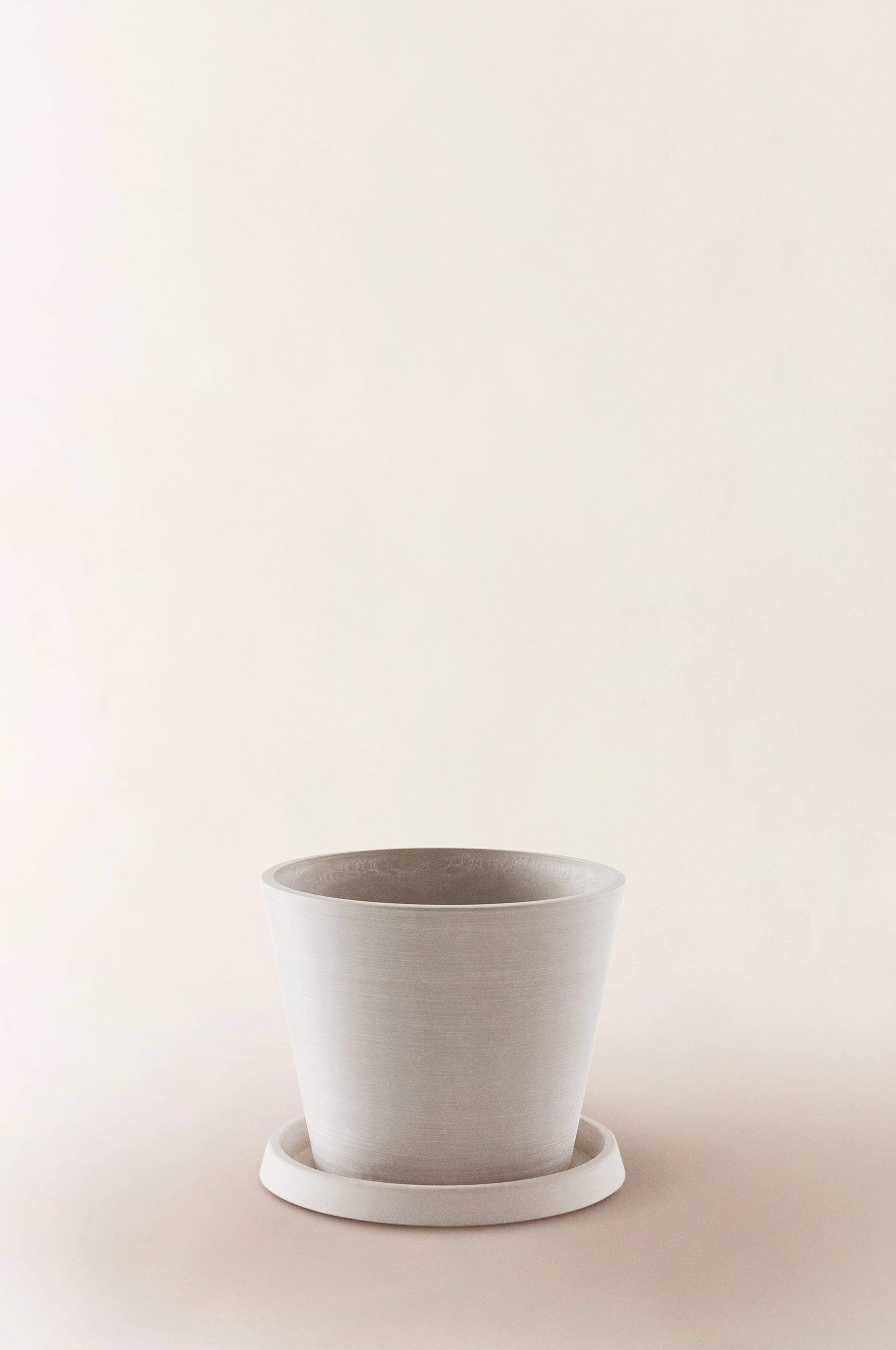 Kruka och fat i rak, stilren modell i ett mycket lätt och tåligt material som fungerar både ute och inne. Krukan och fatet är vädertåliga och tål frost, de blir inte blekta av solljus och är dessutom återvinningsbara.