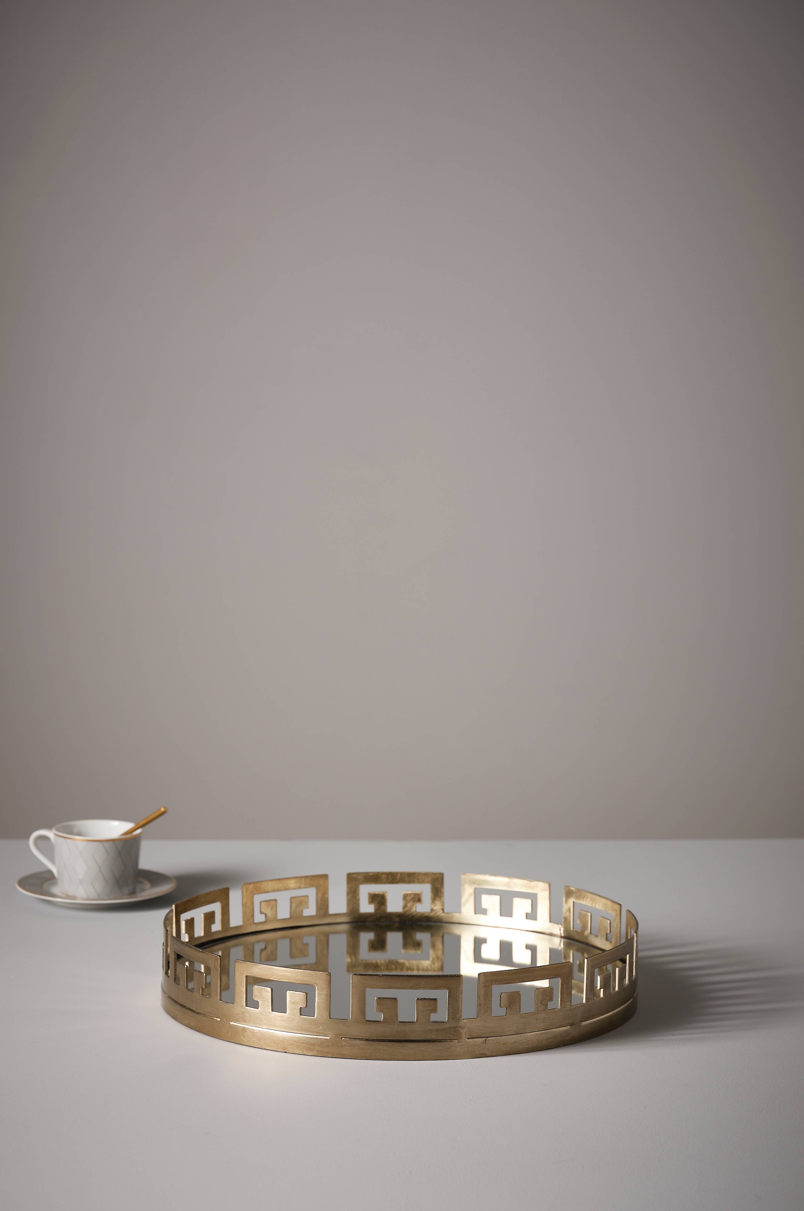 En elegant bricka i metall med spegel i botten. En stilren bricka skapar en lyxig känsla i rummet.