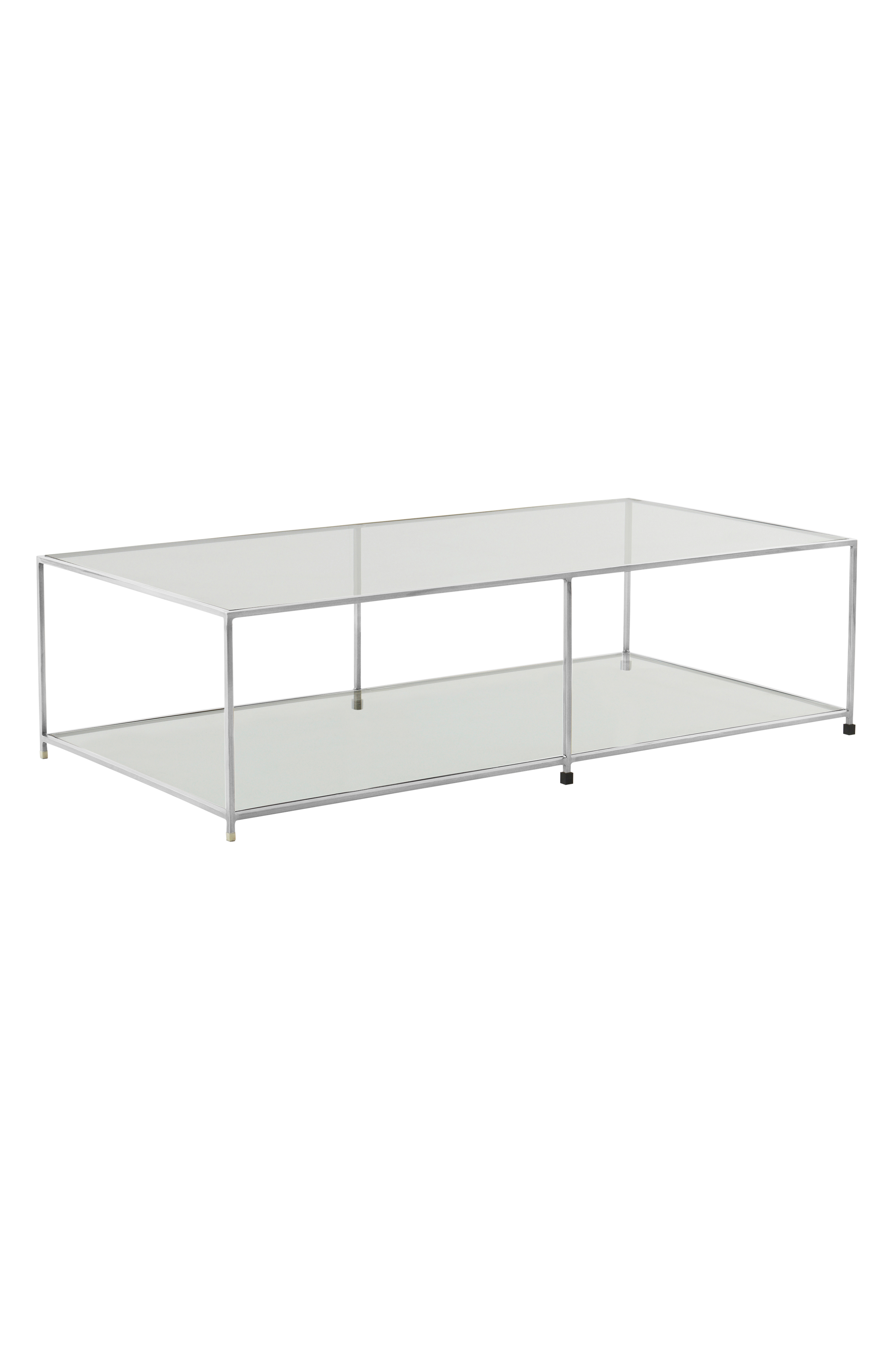 Rektangulärt soffbord i metall och klarglas. Den nätta, smidiga metallstommen har både avlastningsyta och borsskiva i klarglas vilket förstärker möbelns lätta känsla.