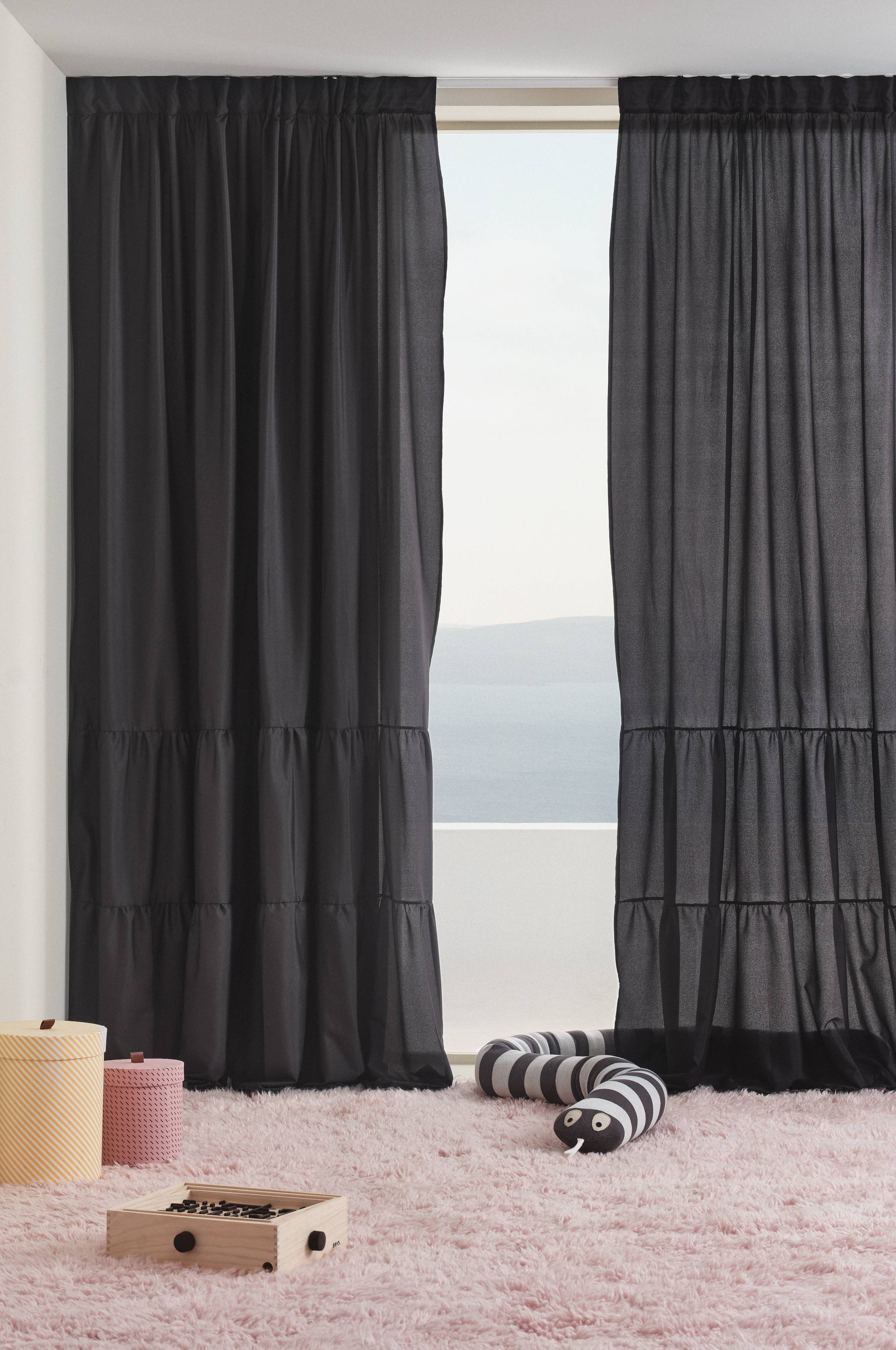 Två gardinlängder i enfärgat tyg av polyester i fina färger som skimrar och glittrar lite lätt. Längderna har breda volanger nedtill, en fin detalj som gör längderna speciella.
