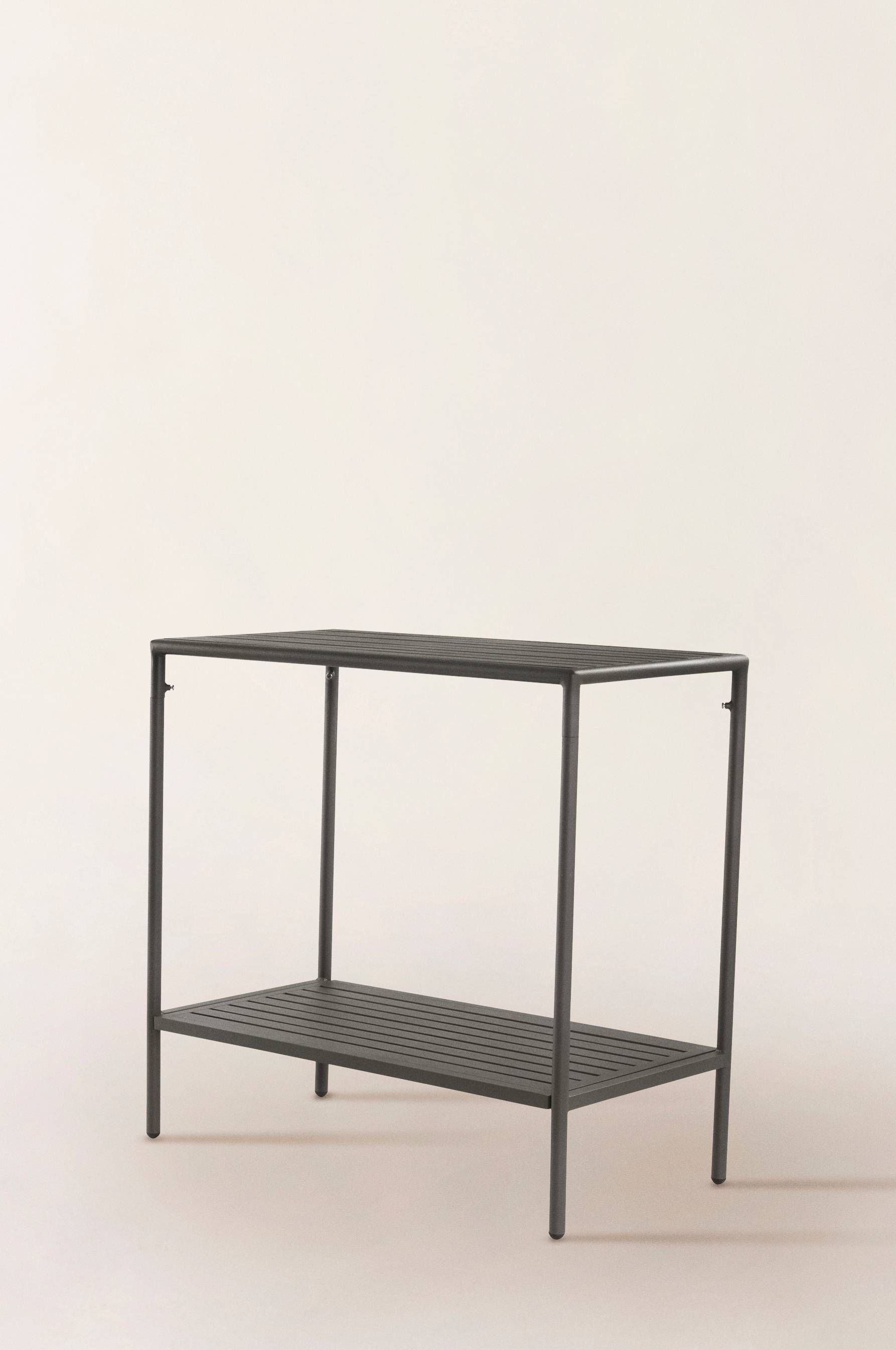 Avlastningsbord av pulverlackerad aluminium med matt yta som inte bländar i solskenet. MENTON tål att stå utomhus och det gör utelivet enklare. Du slipper bära så fort du vill sitta ute. Möbeln är nätt och ger en skön känsla på altanen eller uteplatsen, perfekt intill grillen eller som komplement till uteköket. Bordet har bekväm arbetshöjd och en avlastningshylla under bordsskivan. Låg vikt.