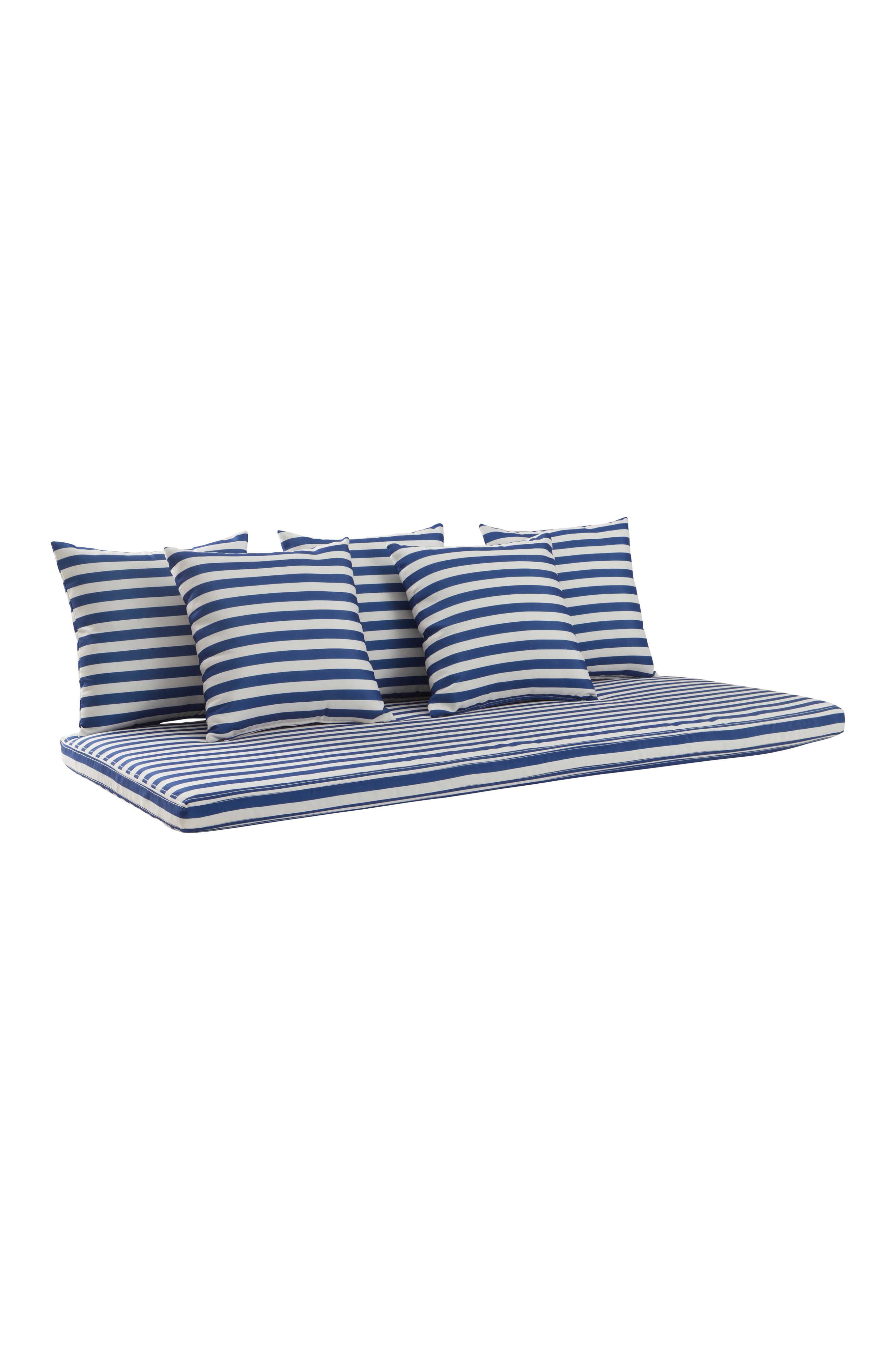 Randigt dynset till utemöbler. Setet innehåller en sittdyna och fem kuddar. Setet har klädsel av polyester med tryckt blommönster och vattenavvisande beläggning. Både dyna och kuddar har innerkudde med skumfyllning. Klädseln är avtagbar och har dragkedja. Tygets slitstyrka 30000 Martindale.