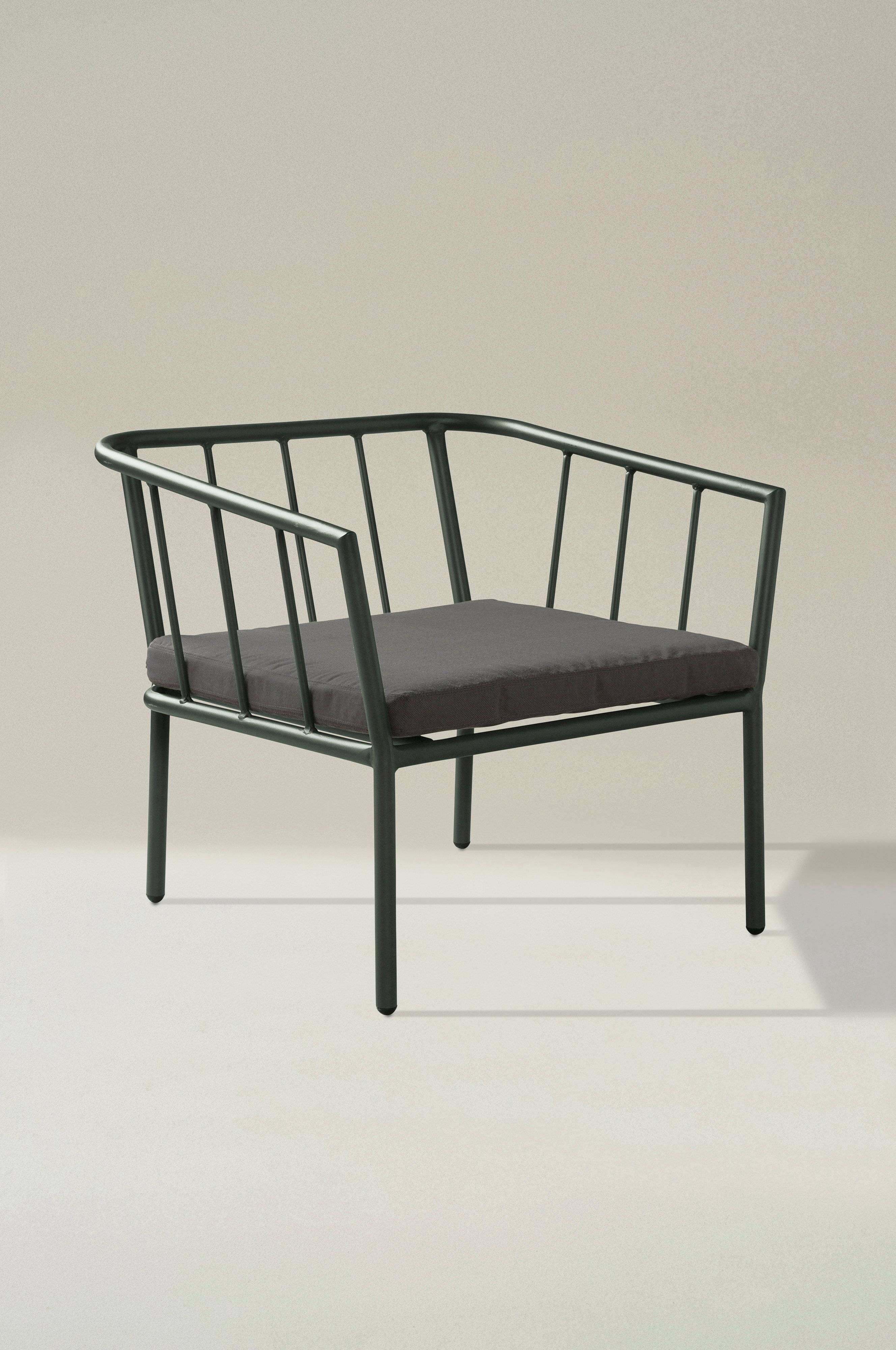 Fåtölj av pulverlackerad aluminium med matt yta som inte bländar i solskenet. Sittdyna med klädsel av polyester och fyllning av skumplastgummi. MENTON tål att stå utomhus och det gör utelivet enklare, aluminium rostar inte. Du slipper bära så fort du vill sitta ute. Möbeln är nätt och ger rätt loungekänsla. .
