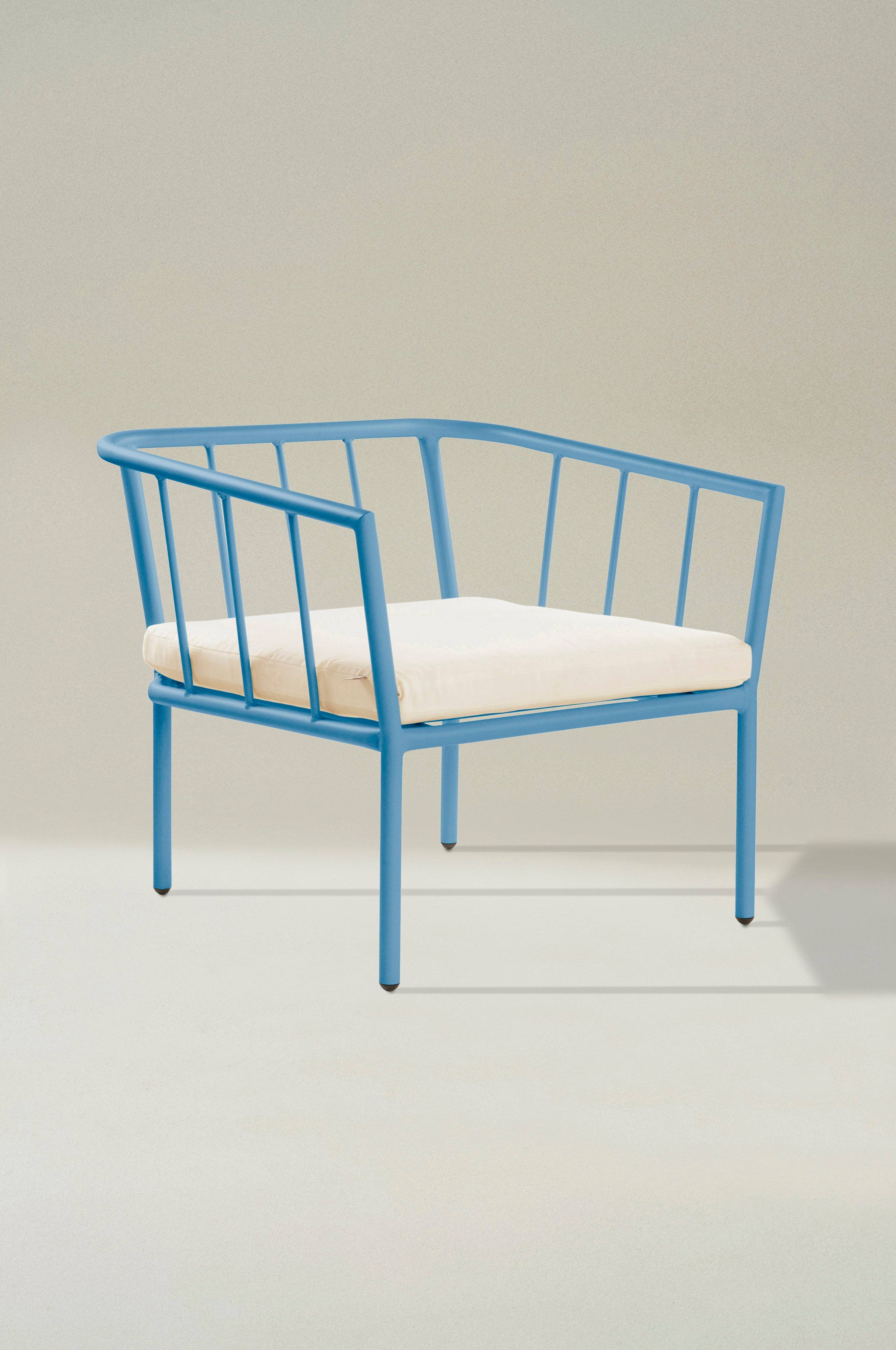 Fåtölj av pulverlackerad aluminium med matt yta som inte bländar i solskenet. Sittdyna med klädsel av polyester och fyllning av skumplastgummi. MENTON tål att stå utomhus och det gör utelivet enklare, aluminium rostar inte. Du slipper bära så fort du vill sitta ute. Möbeln är nätt och ger rätt loungekänsla. .