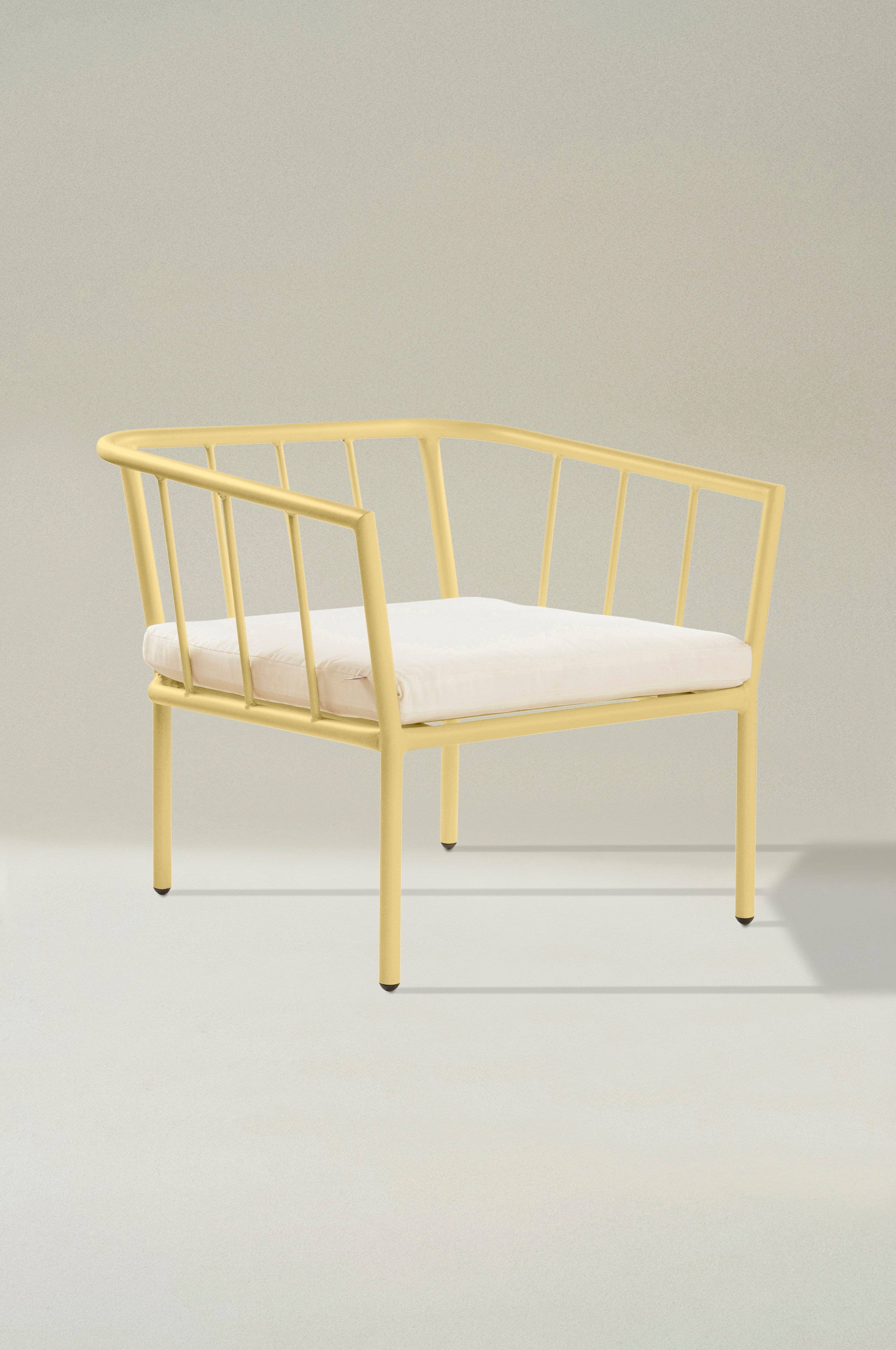 Fåtölj av pulverlackerad aluminium med matt yta som inte bländar i solskenet. Sittdyna med klädsel av polyester och fyllning av skumplastgummi. MENTON tål att stå utomhus och det gör utelivet enklare, aluminium rostar inte. Du slipper bära så fort du vill sitta ute. Möbeln är nätt och ger rätt loungekänsla. .