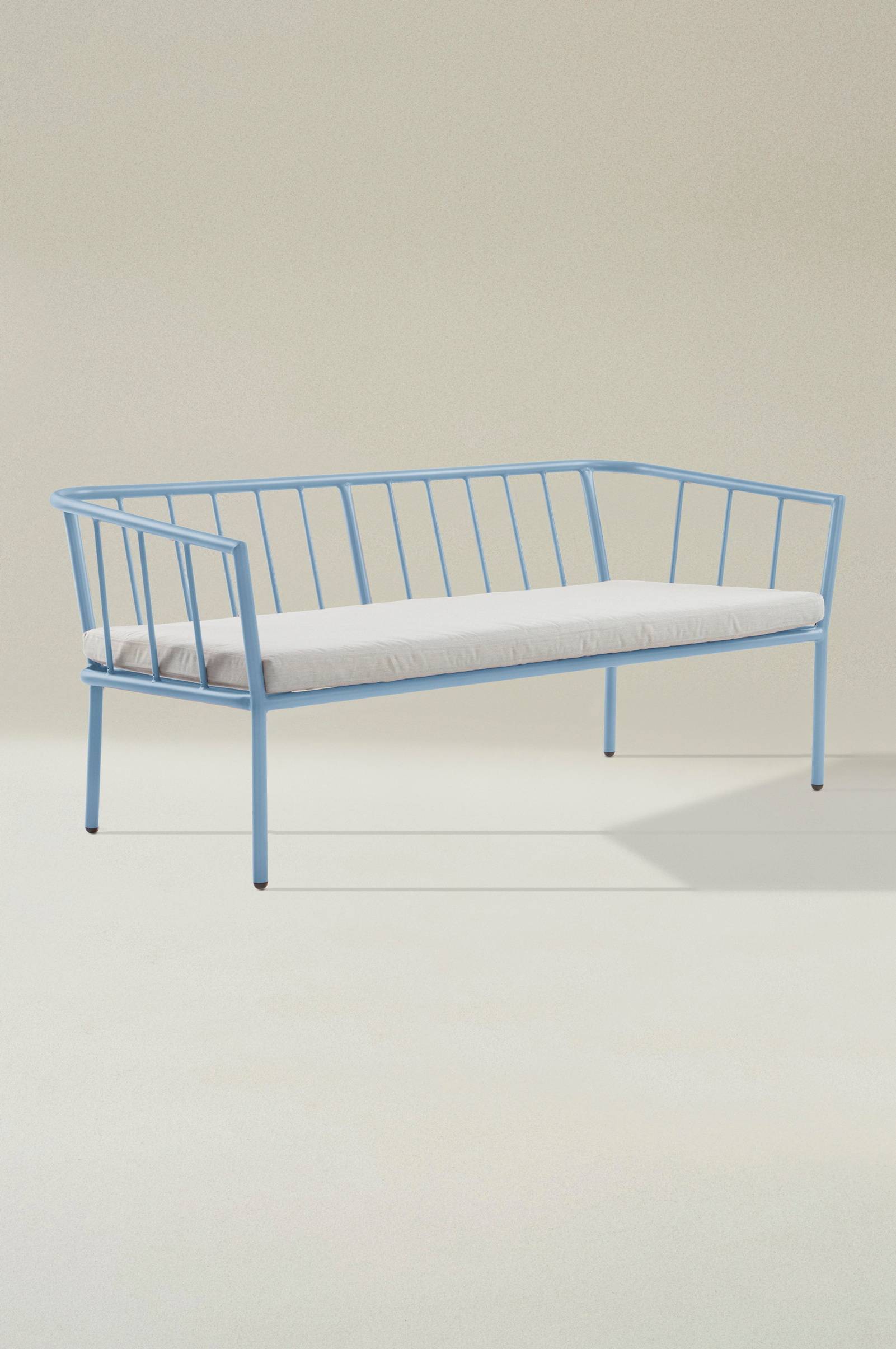 Soffa i pulverlackerad aluminium med matt yta. Sittdyna med klädsel av polyester och foam av skumplastgummi. Det är härligt att flytta ut på balkongen eller i trädgården när sommaren är här. MENTON tål att stå utomhus och det gör utelivet enklare. Du slipper bära så fort du vill sitta ute. Soffan är nätt och har skönt sittdjup och den låga sitthöjden ger skön loungekänsla. Sittdynan ingår och soffan blir extra trevlig om du kompletterar den med härliga kuddar längs ryggstödet. Enfärgade och mönstrade ger möjlighet till rolig variation. Låg vikt. MENTON är enkla att stapla vid förvaring.