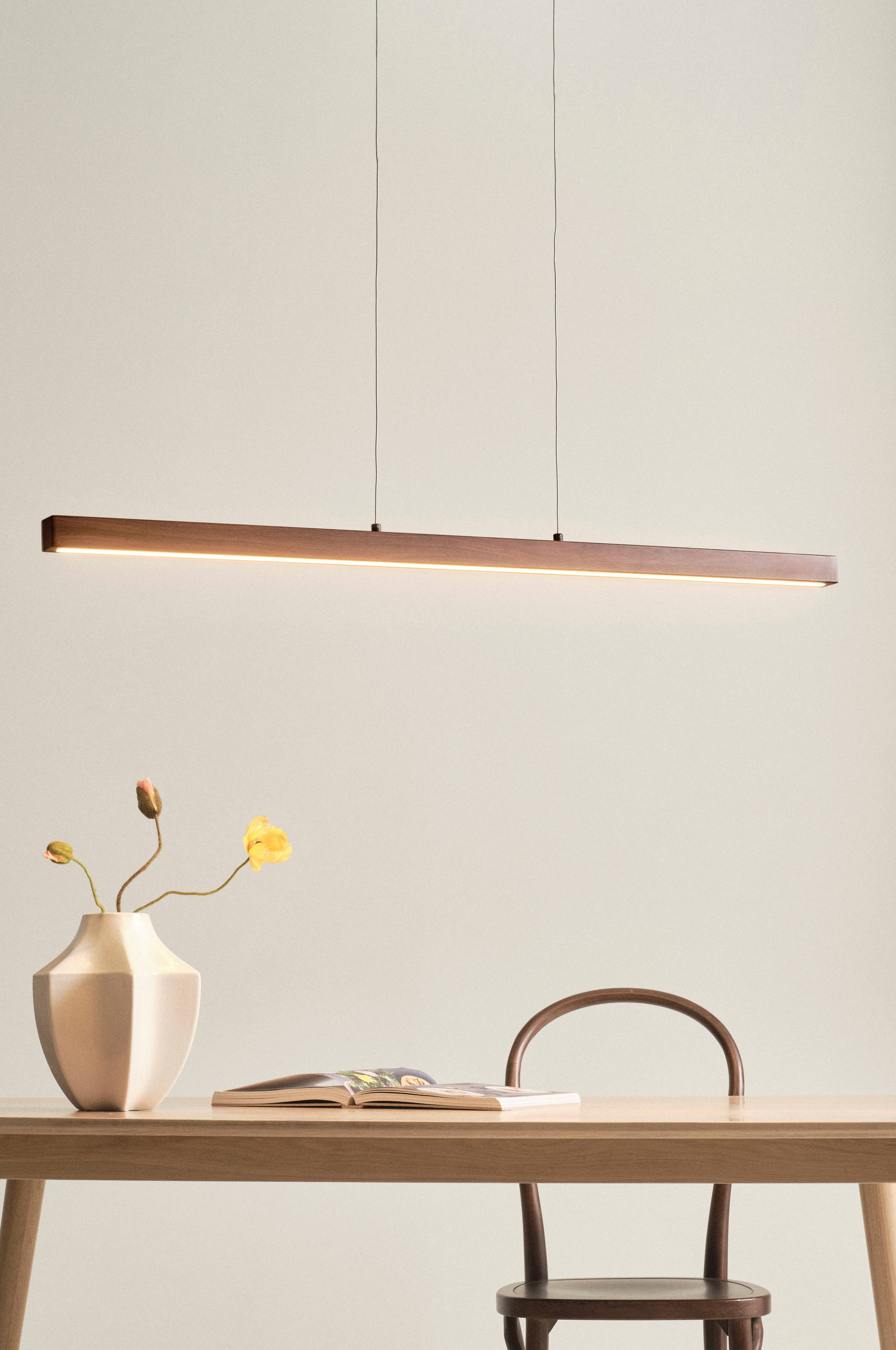 Taklampa av valnötsmönstrad stål med LED-belysning. METIS har ett stilrent och grafiskt uttryck som ger ditt rum trendig belysning på ett smakfullt sätt. Denna typ av linjär armatur passar som arbetsbelysning ovanför en köksö eller ett skrivbord likväl som ovanför matbordet. Ytan har tryckt mönster. Den smäckra lampan hänger i vajrar från takfästet och höjden är justerbar. Transparent sladd. Svart takkopp av stål med krok för upphängning.