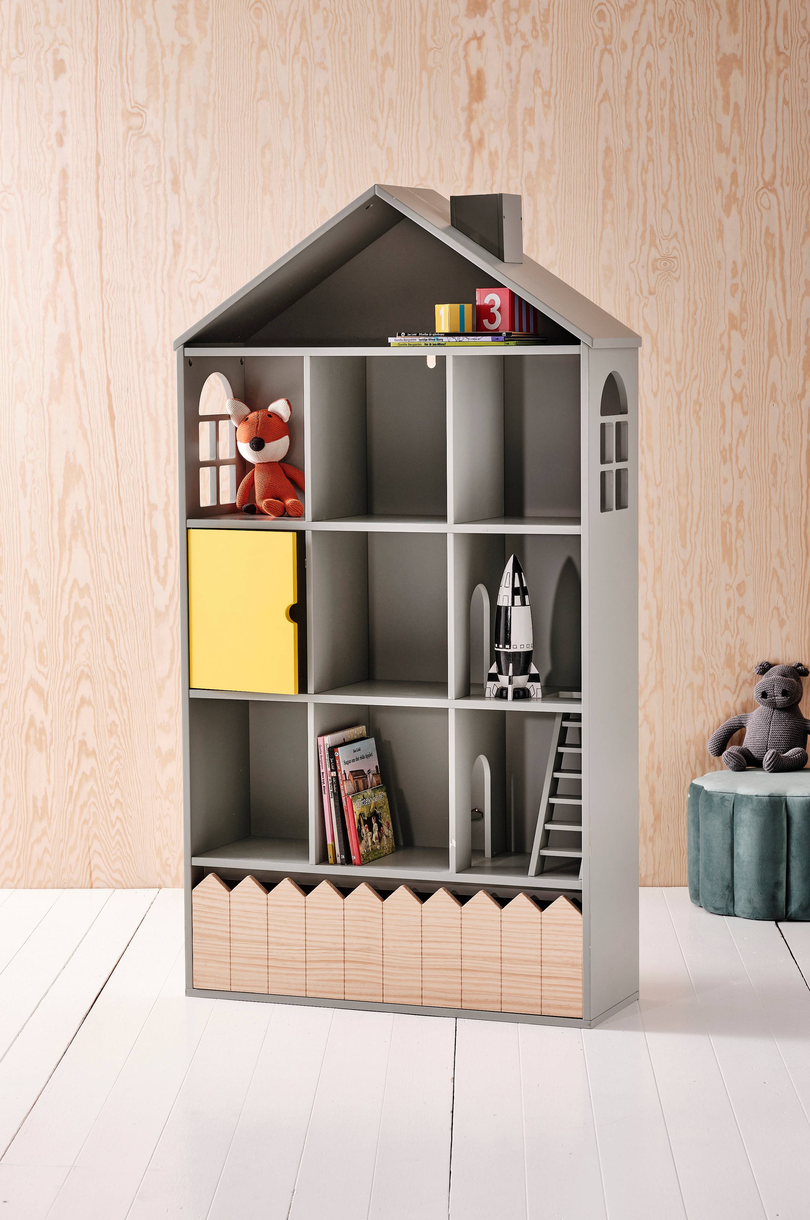 Hylla i målad MDF och furu. Hyllan har tre våningar, nio rum och en vind. Fönster på sidorna och en dörr i avvikande färg. Låda med furufront längst ner. Levereras omonterat. Monteringsanvisning medföljer.
