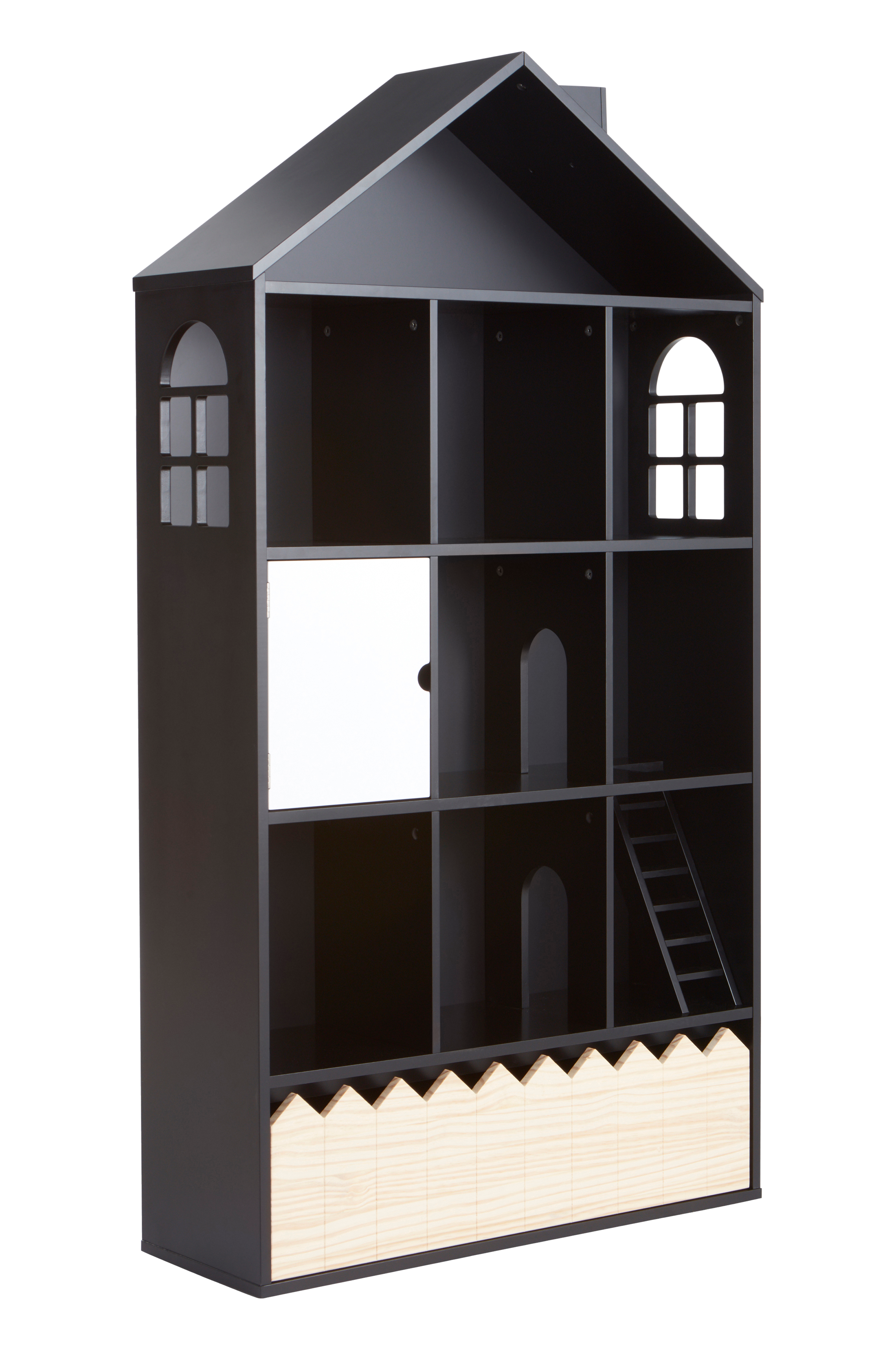 Hylla i målad MDF och furu. Hyllan har tre våningar, nio rum och en vind. Fönster på sidorna och en dörr i avvikande färg. Låda med furufront längst ner. Levereras omonterat. Monteringsanvisning medföljer.