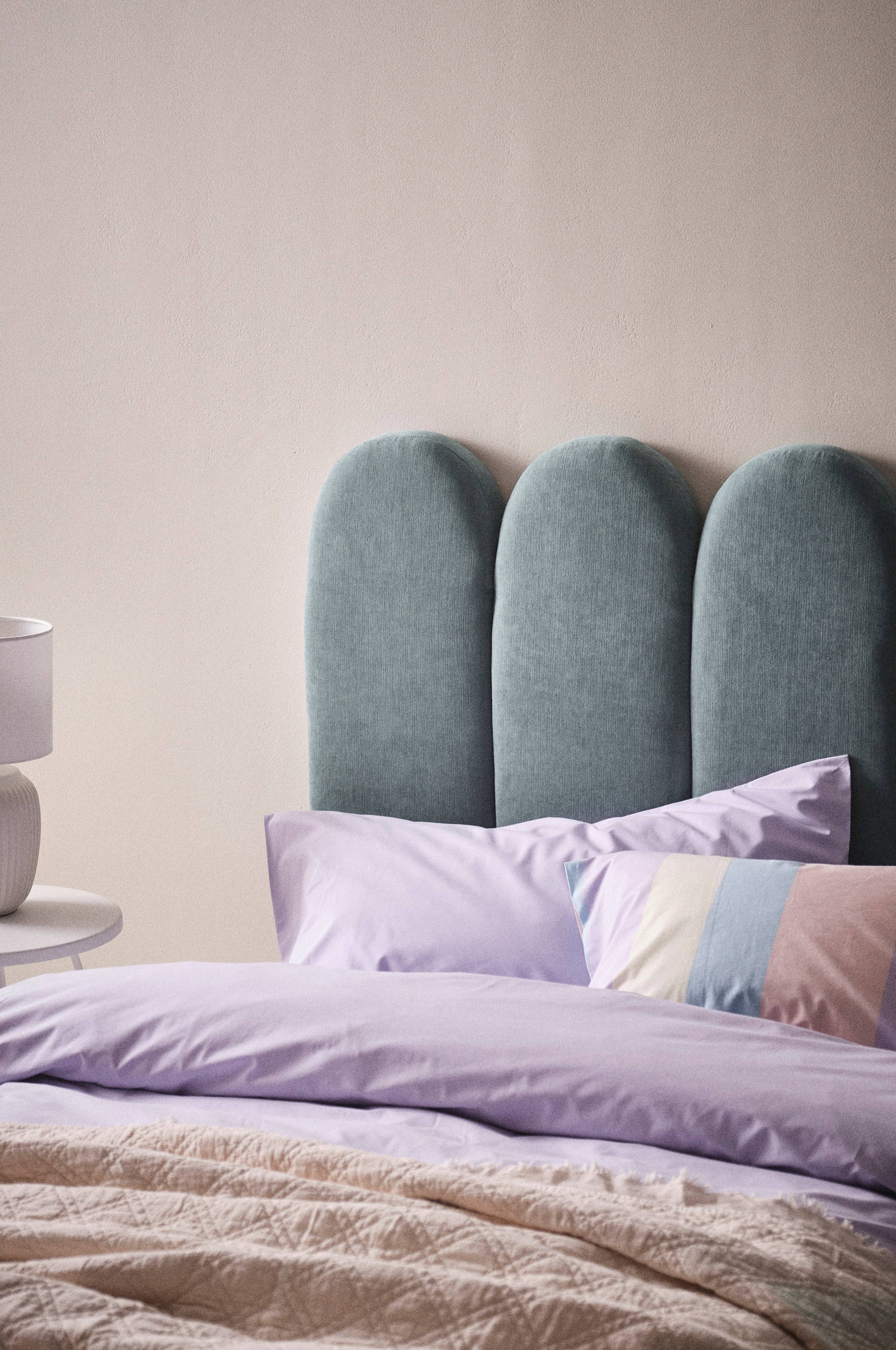 Sänggavel i mjuk och lekfull form med vaddering som gör den bekväm att sitta och luta sig mot. Sänggaveln är klädd med skönt chenilletyg som är tåligt och har en slitstyrka på 33000 Martindale. Stommen är av FSC-märkt furu och plywood som kompletterats med mjuk skumfyllning. Sänggaveln monteras mot väggen bakom din resårmadrass. Överdraget är ej avtagbart. Väggfäste medföljer.