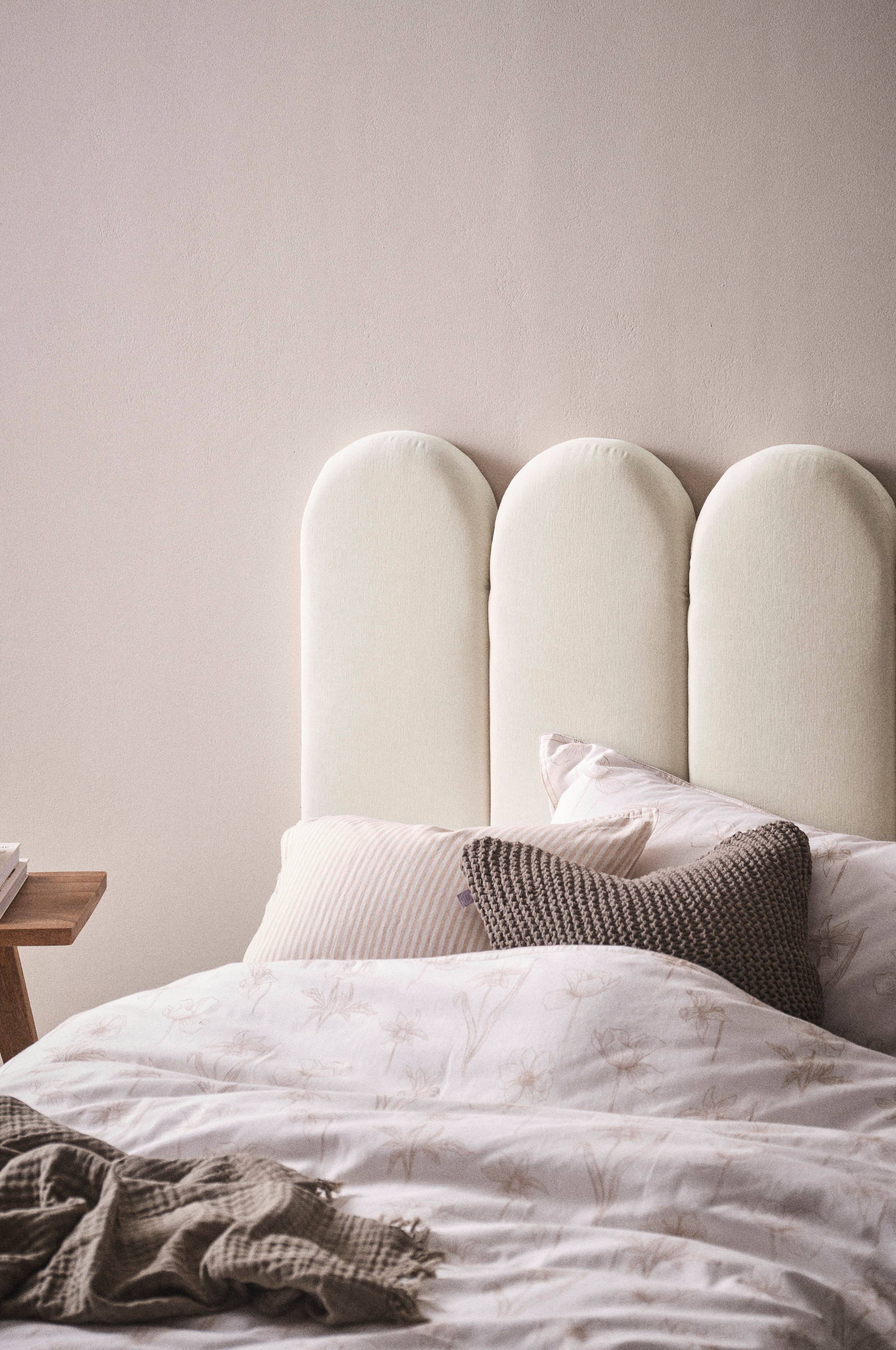Sänggavel i mjuk och lekfull form med vaddering som gör den bekväm att sitta och luta sig mot. Sänggaveln är klädd med skönt chenilletyg som är tåligt och har en slitstyrka på 33000 Martindale. Stommen är av FSC-märkt furu och plywood som kompletterats med mjuk skumfyllning. Sänggaveln monteras mot väggen bakom din resårmadrass. Överdraget är ej avtagbart. Väggfäste medföljer.