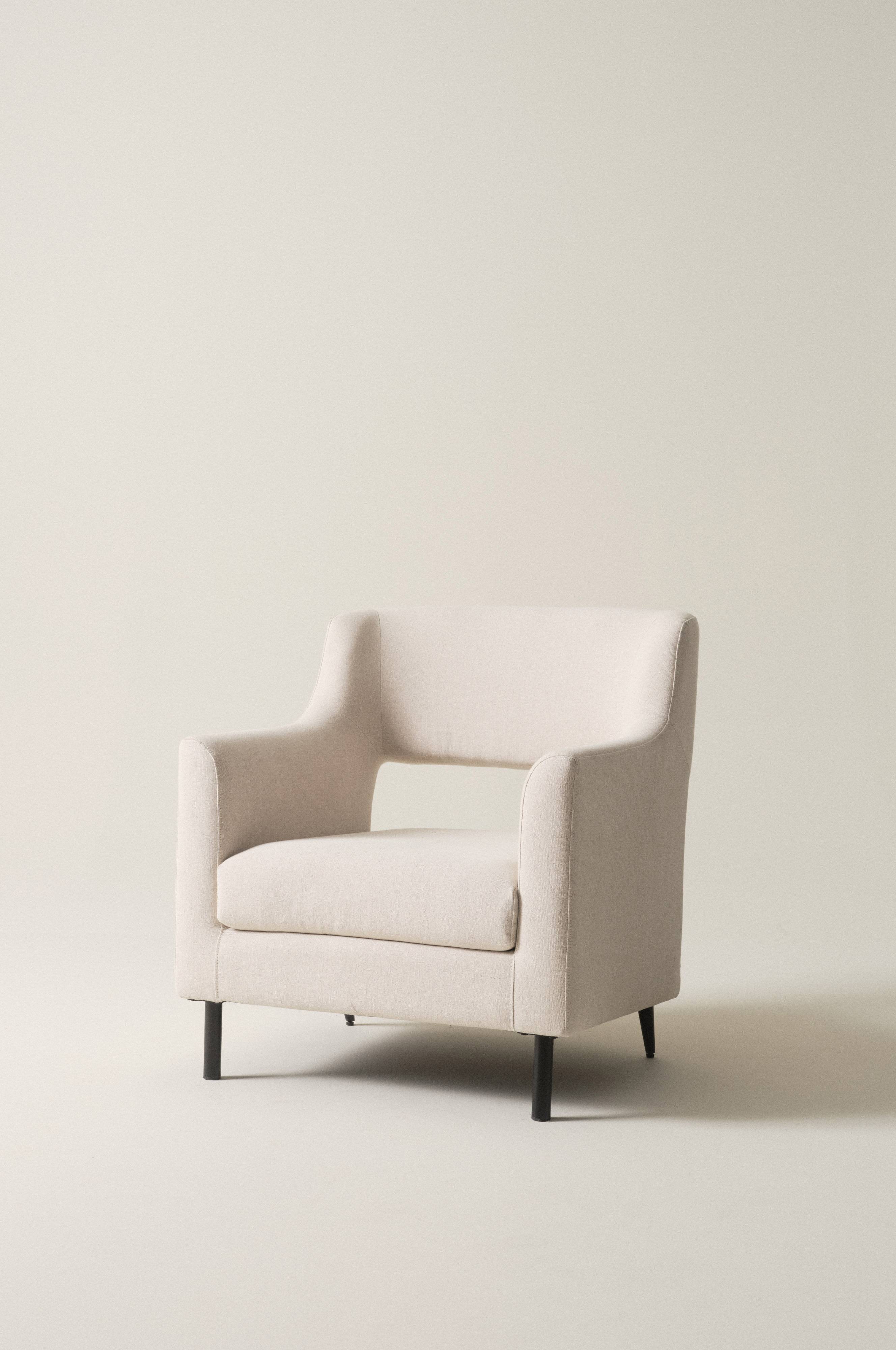 Stilren fåtölj med stomme av furu och mjuk klädsel i linne- och bomullsblandning. MILDRED har en unik form med spännande detaljer och blir snabbt rummets blickfång med sina mjuka fina former och nätta metallben.