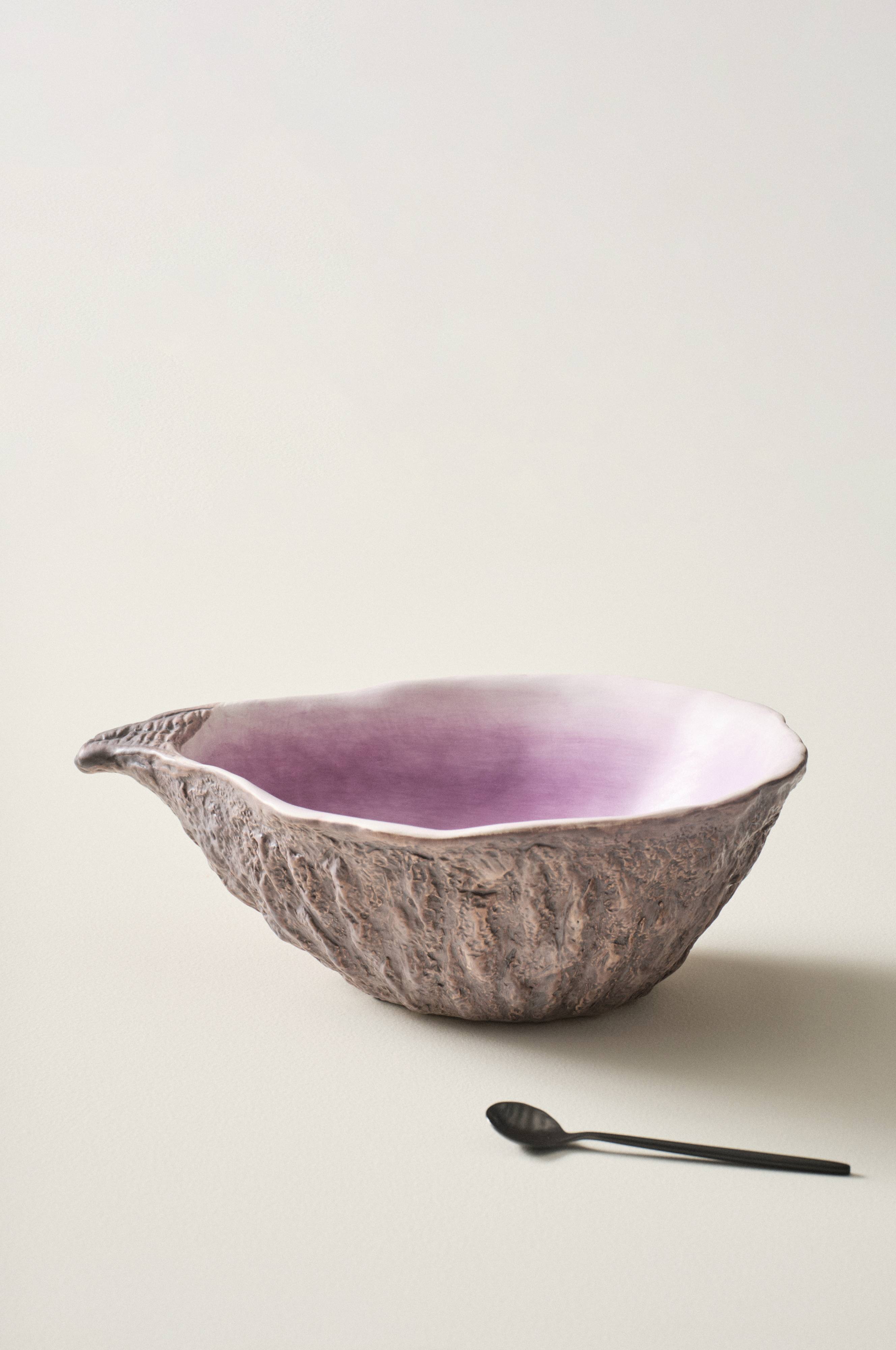 Vacker skål av dolomitporslin. Skålen påminner om ett stort ostron och den matta glasyren går i vackra grå och lila nyanser. Utsidan har fin, lite grövre struktur. MILO gör en härlig räksallad rättvisa och är dessutom fin som prydnadsskål.