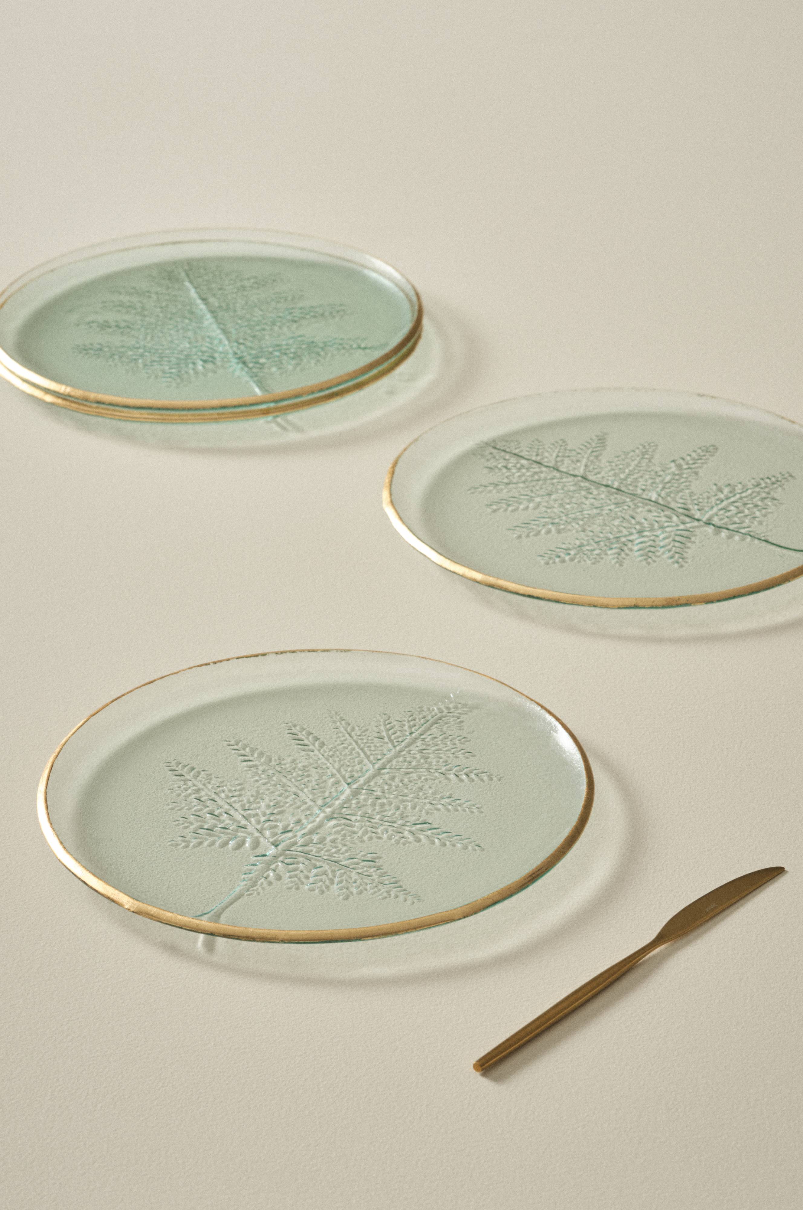 4-pack tallrikar av glas med fint lövmönster och guldfärgad kantning. Mio är en mycket dekorativ tallrik som passar lika fint att servera maten på som att använda som uppläggningsfat, kanske på ett vackert buffébord.