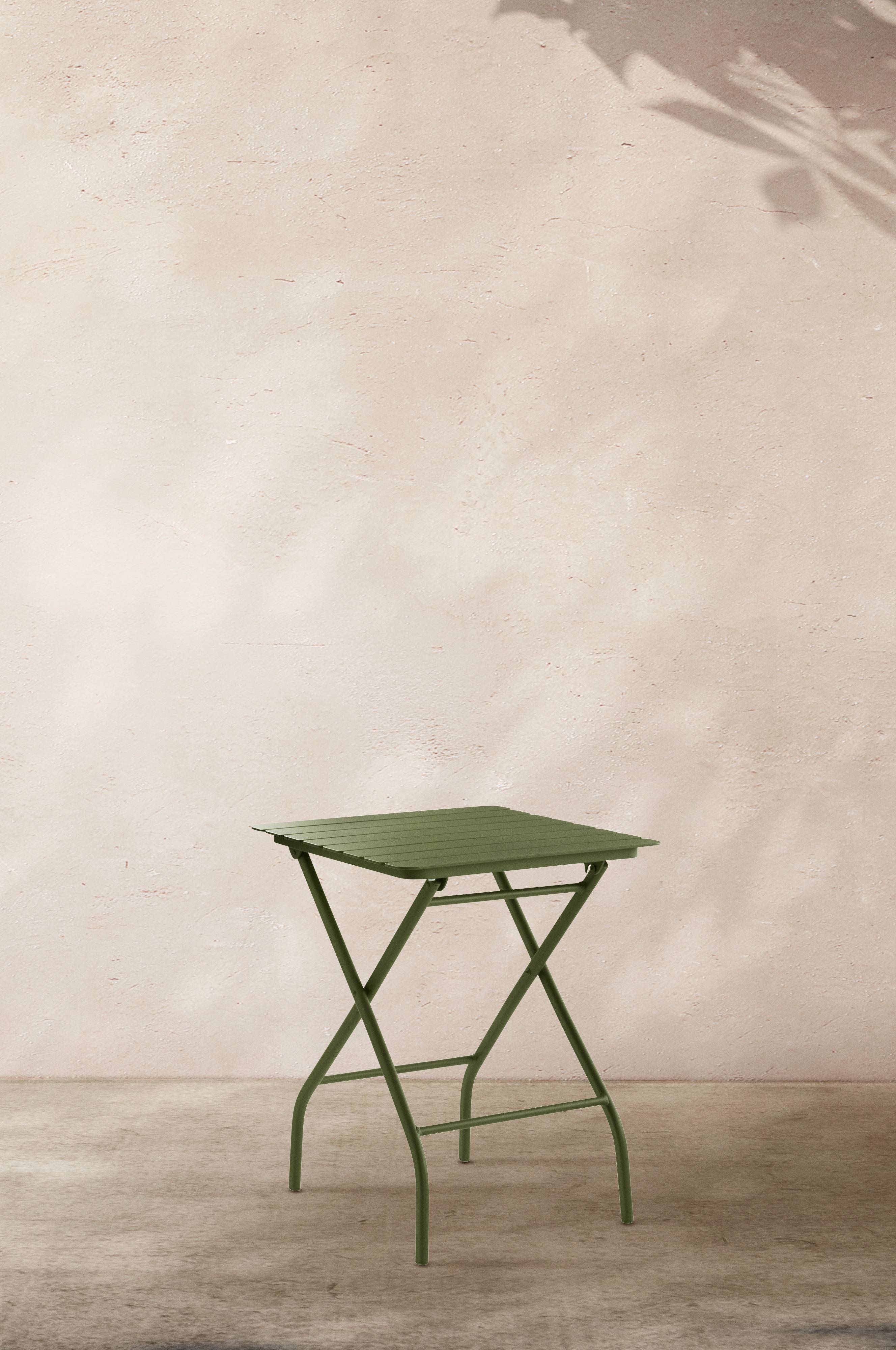 Cafébord av pulverlackerad aluminium med matt yta som inte bländar i solskenet. Ett smidigt litet bord som andas trädgårdsromanitk. Hopfällbar modell, praktiskt vid vinterförvaring och om du har liten balkong. MONTMARTRE tål att förvaras utomhus, aluminium rostar inte. Låg vikt.